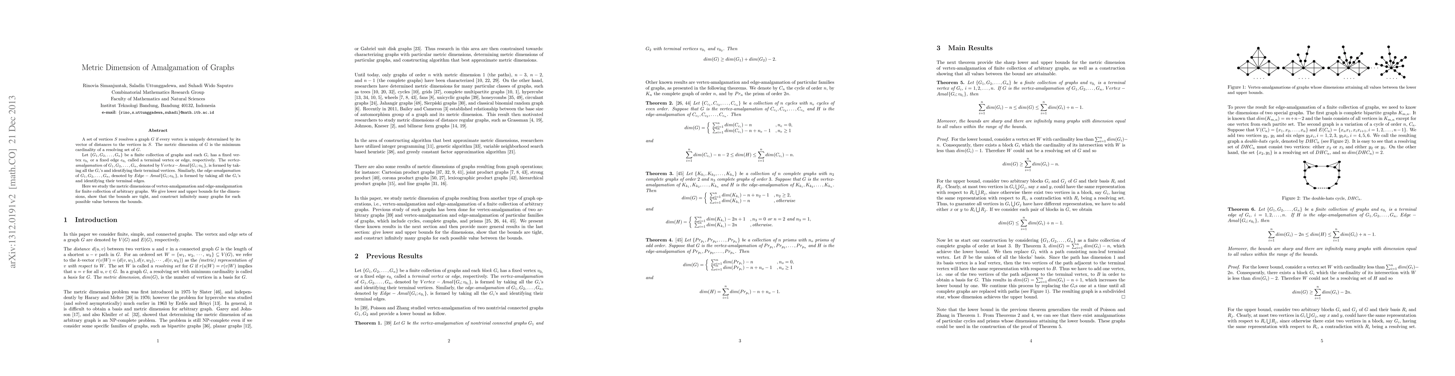 A set of vertices $S$ resolves a graph $G$ if every vertex is uniquely determined by its vector of distances to the vertices in $S$. The metric dimension of $G$ is the minimum cardinality of a resolving set of $G$. Let $\{G_1, G_2, \ldots, G_n\}$ be a finite collection of graphs and each $G_i$ has a fixed vertex $v_{0_i}$ or a fixed edge $e_{0_i}$ called a terminal vertex or edge, respectively. The \emph{vertex-amalgamation} of $G_1, G_2, \ldots, G_n$, denoted by $Vertex-Amal\{G_i;v_{0_i}\}$, is formed by taking all the $G_i$'s and identifying their terminal vertices. Similarly, the \emph{edge-amalgamation} of $G_1, G_2, \ldots, G_n$, denoted by $Edge-Amal\{G_i;e_{0_i}\}$, is formed by taking all the $G_i$'s and identifying their terminal edges. Here we study the metric dimensions of vertex-amalgamation and edge-amalgamation for finite collection of arbitrary graphs. We give lower and upper bounds for the dimensions, show that the bounds are tight, and construct infinitely many graphs for each possible value between the bounds.