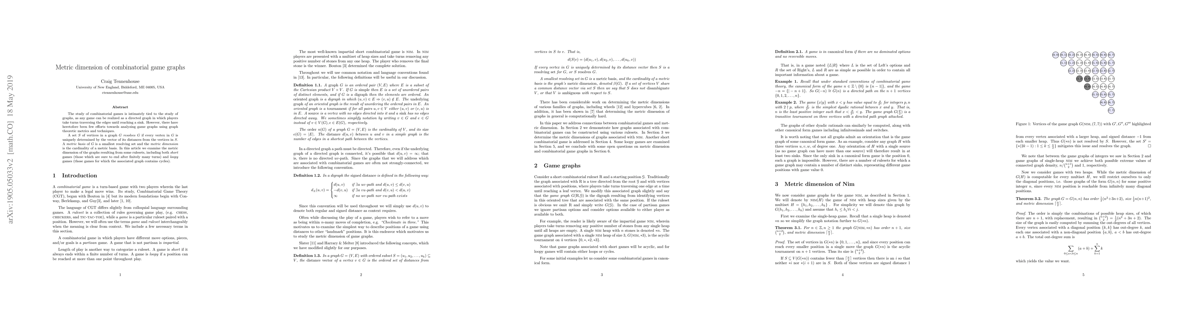 The study of combinatorial games is intimately tied to the study of graphs, as any game can be realized as a directed graph in which players take turns traversing the edges until reaching a sink. However, there have heretofore been few efforts towards analyzing game graphs using graph theoretic metrics and techniques. A set $S$ of vertices in a graph $G$ resolves $G$ if every vertex in $G$ is uniquely determined by the vector of its distances from the vertices in $S$. A metric basis of $G$ is a smallest resolving set and the metric dimension is the cardinality of a metric basis. In this article we examine the metric dimension of the graphs resulting from some rulesets, including both short games (those which are sure to end after finitely many turns) and loopy games (those games for which the associated graph contains cycles).