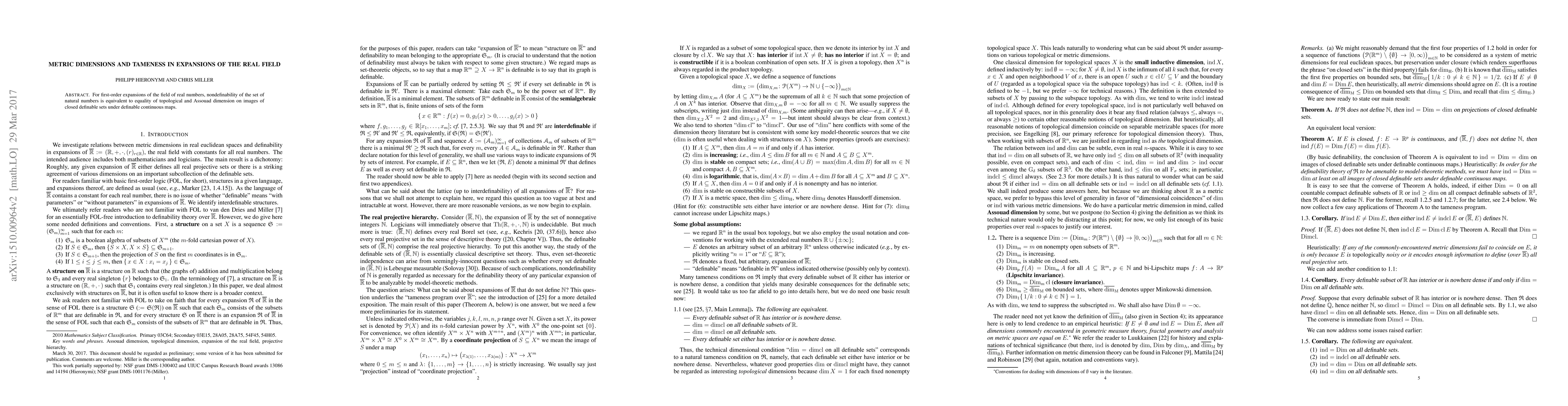 For first-order expansions of the field of real numbers, nondefinability of the set of natural numbers is equivalent to equality of topological and Assouad dimension on images of closed definable sets under definable continuous maps.