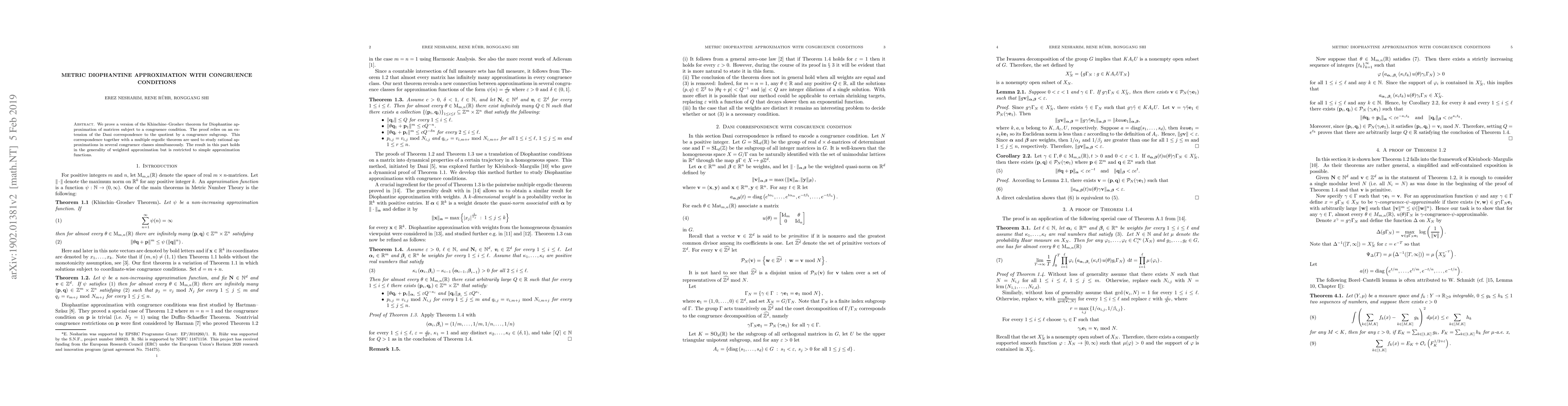 We prove a version of the Khinchine--Groshev theorem for Diophantine approximation of matrices subject to a congruence condition. The proof relies on an extension of the Dani correspondence to the quotient by a congruence subgroup. This correspondence together with a multiple ergodic theorem are used to study rational approximations in several congruence classes simultaneously. The result in this part holds in the generality of weighted approximation but is restricted to simple approximation functions.