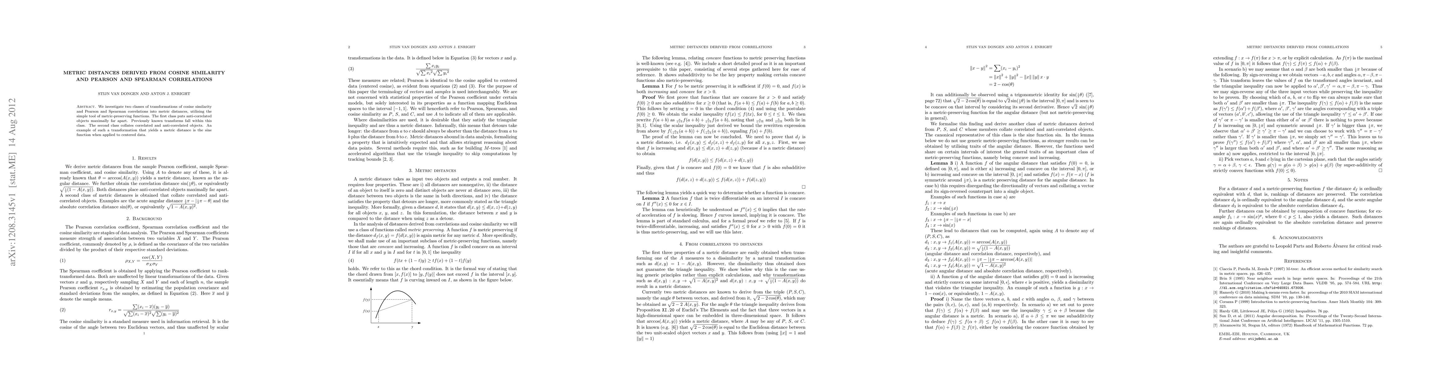 This paper explores two classes of transformations converting cosine similarity and Pearson and Spearman correlations into metric distances, using metric-preserving functions. The first class maximizes the distance between anti-correlated objects, while the second class brings correlated and anti-correlated objects closer together, exemplified by the sine function applied to centered data.
