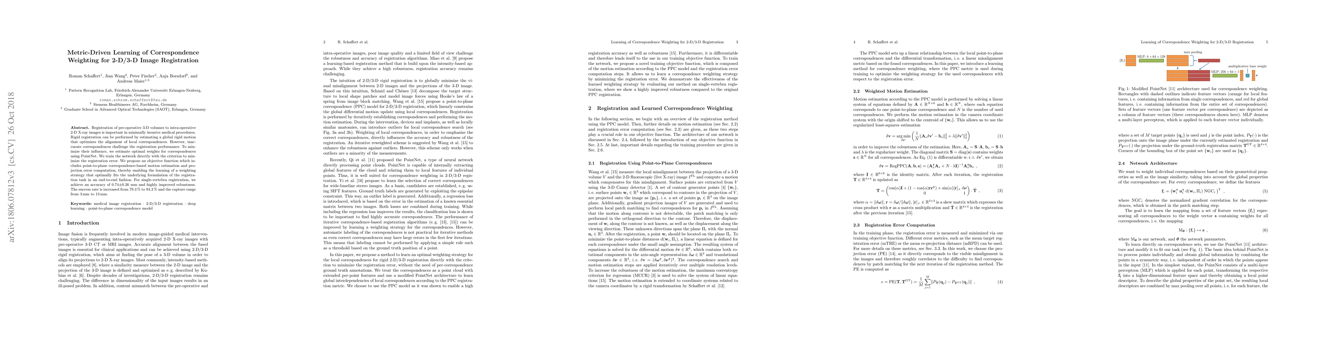This paper proposes an end-to-end metric-driven learning method using PointNet to estimate optimal correspondence weights for 2-D/3-D image registration in medical procedures, achieving improved accuracy and robustness in vertebra registration. The method enhances registration success rate and capture range significantly.