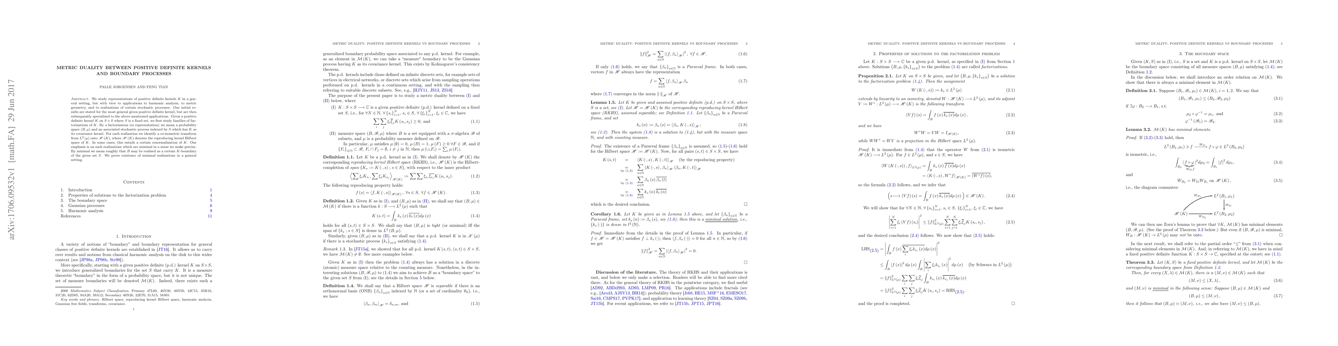 We study representations of positive definite kernels $K$ in a general setting, but with view to applications to harmonic analysis, to metric geometry, and to realizations of certain stochastic processes. Our initial results are stated for the most general given positive definite kernel, but are then subsequently specialized to the above mentioned applications. Given a positive definite kernel $K$ on $S\times S$ where $S$ is a fixed set, we first study families of factorizations of $K$. By a factorization (or representation) we mean a probability space $\left(B,\mu\right)$ and an associated stochastic process indexed by $S$ which has $K$ as its covariance kernel. For each realization we identify a co-isometric transform from $L^{2}\left(\mu\right)$ onto $\mathscr{H}\left(K\right)$, where $\mathscr{H}\left(K\right)$ denotes the reproducing kernel Hilbert space of $K$. In some cases, this entails a certain renormalization of $K$. Our emphasis is on such realizations which are minimal in a sense we make precise. By minimal we mean roughly that $B$ may be realized as a certain $K$-boundary of the given set $S$. We prove existence of minimal realizations in a general setting.