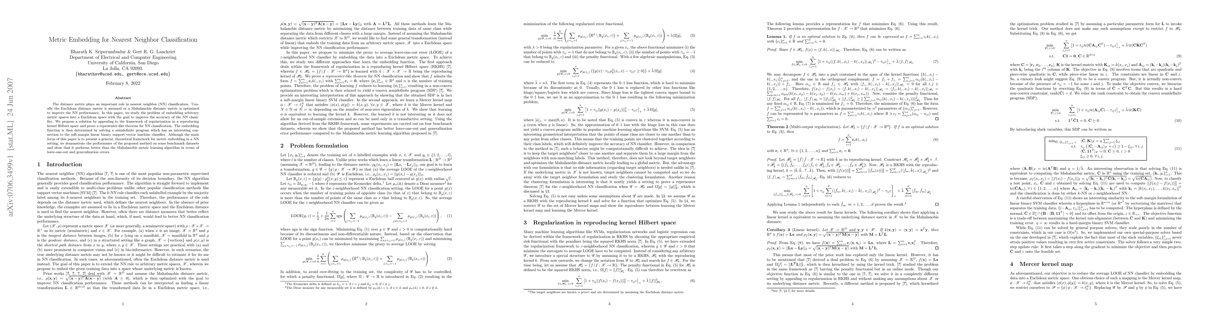 This paper proposes a method for embedding arbitrary metric spaces into Euclidean space to enhance nearest neighbor classification accuracy. It utilizes regularization in a reproducing kernel Hilbert space and solves a semidefinite program, demonstrating improved performance over Mahalanobis metric learning on benchmark datasets.