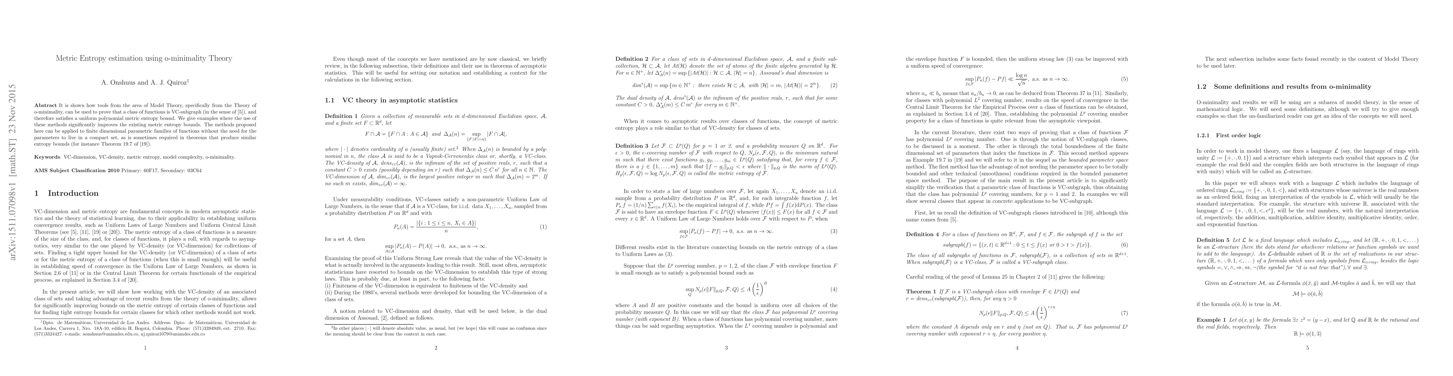 This paper uses o-minimality theory from model theory to demonstrate that a class of functions is VC-subgraph, thereby establishing a uniform polynomial metric entropy bound. The proposed methods enhance existing metric entropy bounds and apply to finite-dimensional parametric families without requiring parameter compactness.