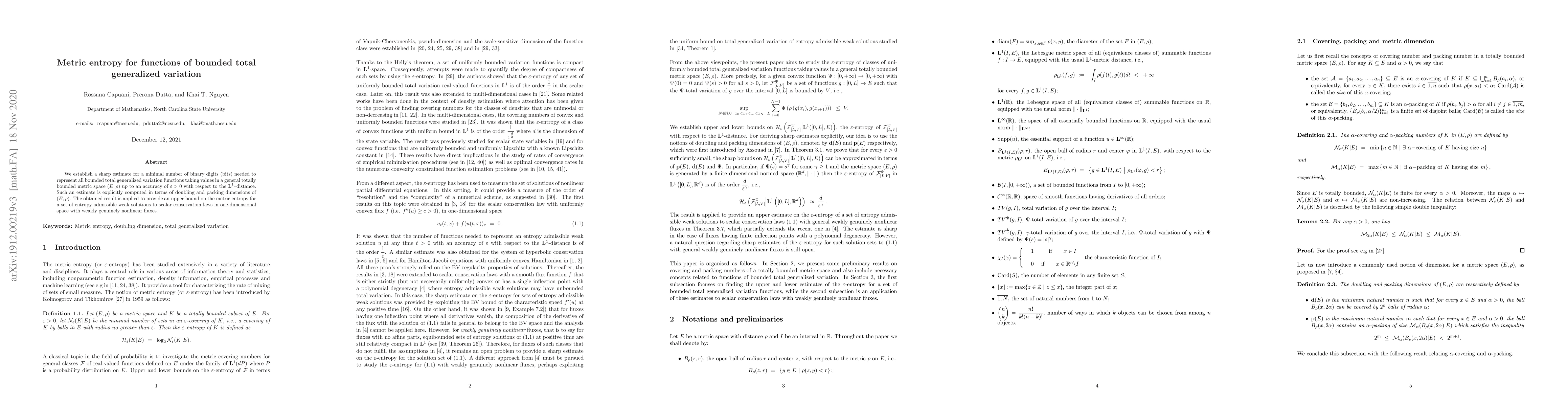 This paper establishes a sharp estimate for the minimal number of bits needed to represent bounded total generalized variation functions in a metric space, computed in terms of the space's doubling and packing dimensions. It then applies this result to derive an upper bound on the metric entropy for entropy admissible weak solutions to scalar conservation laws.
