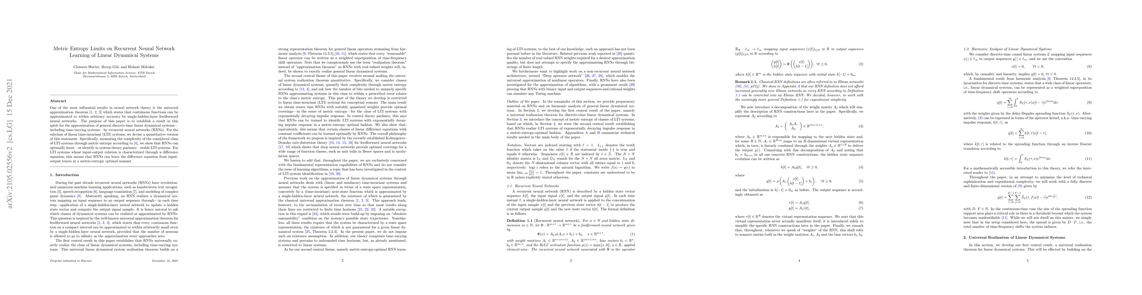 This paper establishes that recurrent neural networks (RNNs) can optimally learn stable linear time-invariant (LTI) systems by identifying their difference equations, measured through metric entropy, thereby extending the universal approximation theorem to linear dynamical systems.