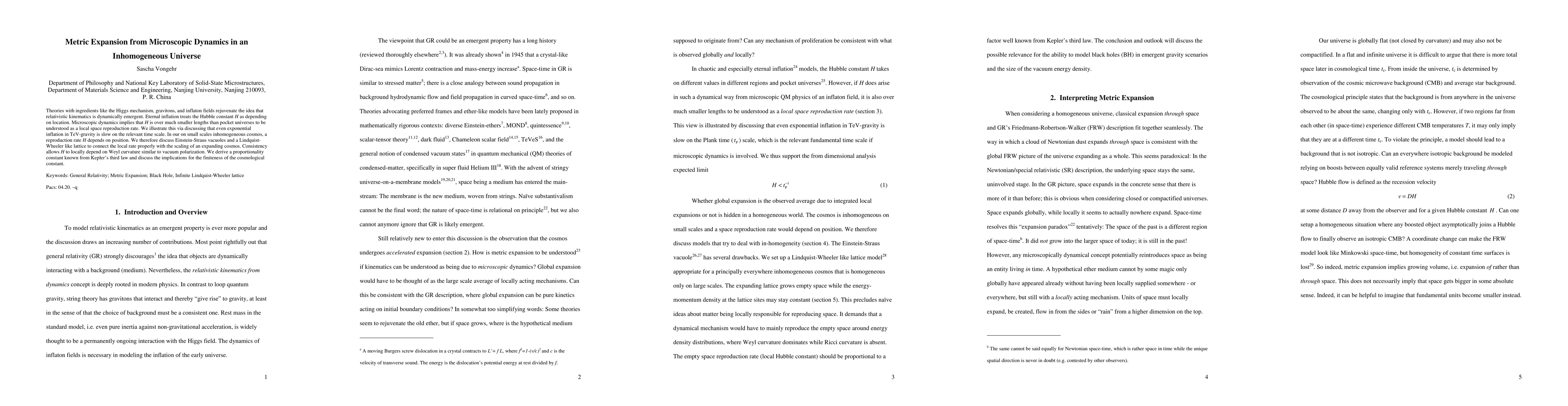 Theories with ingredients like the Higgs mechanism, gravitons, and inflaton fields rejuvenate the idea that relativistic kinematics is dynamically emergent. Eternal inflation treats the Hubble constant H as depending on location. Microscopic dynamics implies that H is over much smaller lengths than pocket universes to be understood as a local space reproduction rate. We illustrate this via discussing that even exponential inflation in TeV-gravity is slow on the relevant time scale. In our on small scales inhomogeneous cosmos, a reproduction rate H depends on position. We therefore discuss Einstein-Straus vacuoles and a Lindquist-Wheeler like lattice to connect the local rate properly with the scaling of an expanding cosmos. Consistency allows H to locally depend on Weyl curvature similar to vacuum polarization. We derive a proportionality constant known from Kepler's third law and discuss the implications for the finiteness of the cosmological constant.