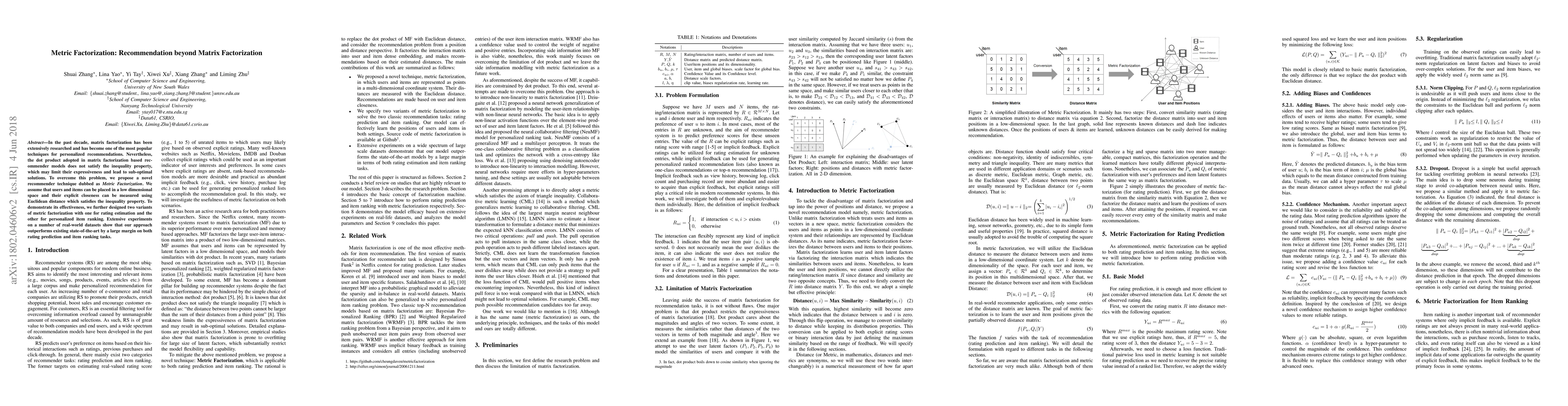 Metric Factorization proposes a new recommendation technique that uses Euclidean distance instead of dot product, addressing limitations of matrix factorization. Experiments show it outperforms existing methods in both rating prediction and personalized item ranking.
