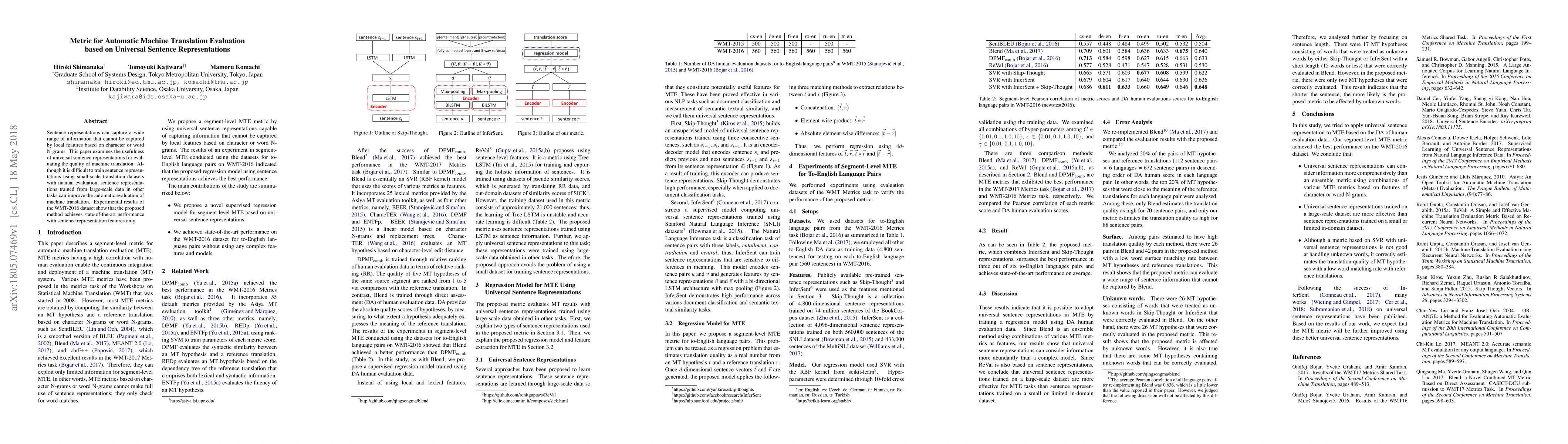 This paper proposes a metric for automatic machine translation evaluation using universal sentence representations, which capture broader contextual information than local features. The method leverages pre-trained representations from large datasets to achieve state-of-the-art performance on the WMT-2016 dataset.