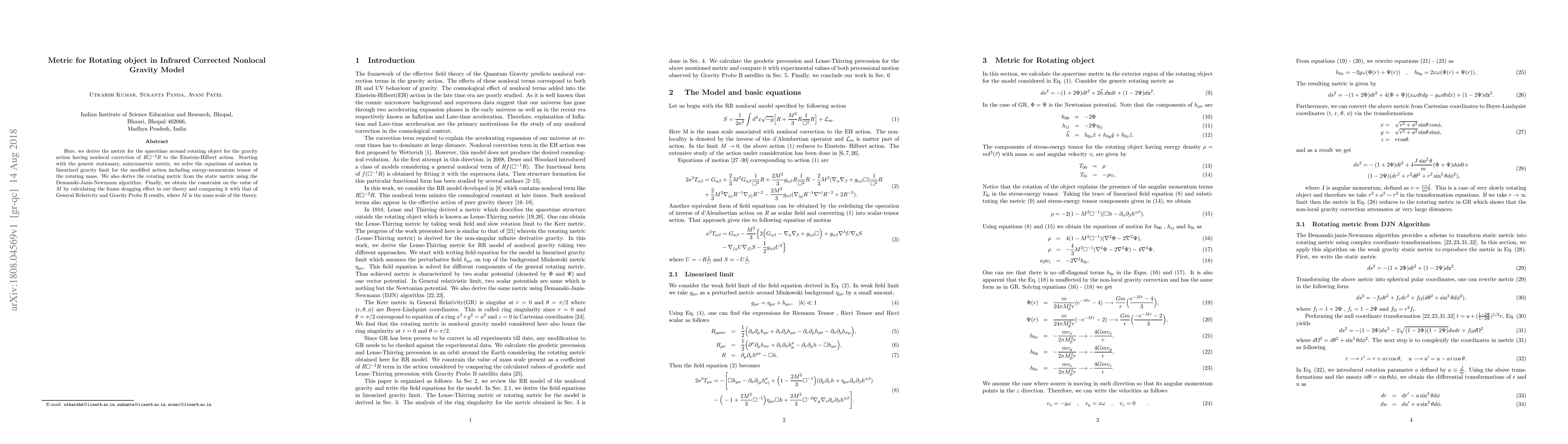 Here, we derive the metric for the spacetime around rotating object for the gravity action having nonlocal correction of $R\Box^{-2} R $ to the Einstein-Hilbert action. Starting with the generic stationary, axisymmetric metric, we solve the equations of motion in linearized gravity limit for the modified action including energy-momentum tensor of the rotating mass. We also derive the rotating metric from the static metric using the Demanski-Janis-Newmann algorithm. Finally, we obtain the constraint on the value of $M$ by calculating the frame dragging effect in our theory and comparing it with that of General Relativity and Gravity Probe B results, where $M$ is the mass scale of the theory.