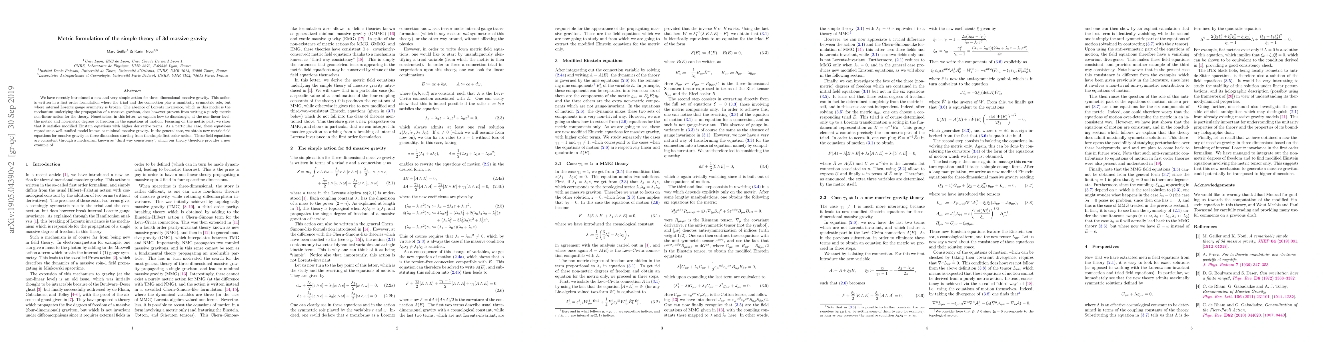 We have recently introduced a new and very simple action for three-dimensional massive gravity. This action is written in a first order formulation where the triad and the connection play a manifestly symmetric role, but where internal Lorentz gauge symmetry is broken. The absence of Lorentz invariance, which in this model is the mechanism underlying the propagation of a massive graviton, does however prevent from writing a purely metric non-linear action for the theory. Nonetheless, in this letter, we explain how to disentangle, at the non-linear level, the metric and non-metric degrees of freedom in the equations of motion. Focusing on the metric part, we show that it satisfies modified Einstein equations with higher derivative terms. As a particular case, these equations reproduce a well-studied model known as minimal massive gravity. In the general case, we obtain new metric field equations for massive gravity in three dimensions starting from the simple first order action. These field equations are consistent through a mechanism known as "third way consistency", which our theory therefore provides a new example of.