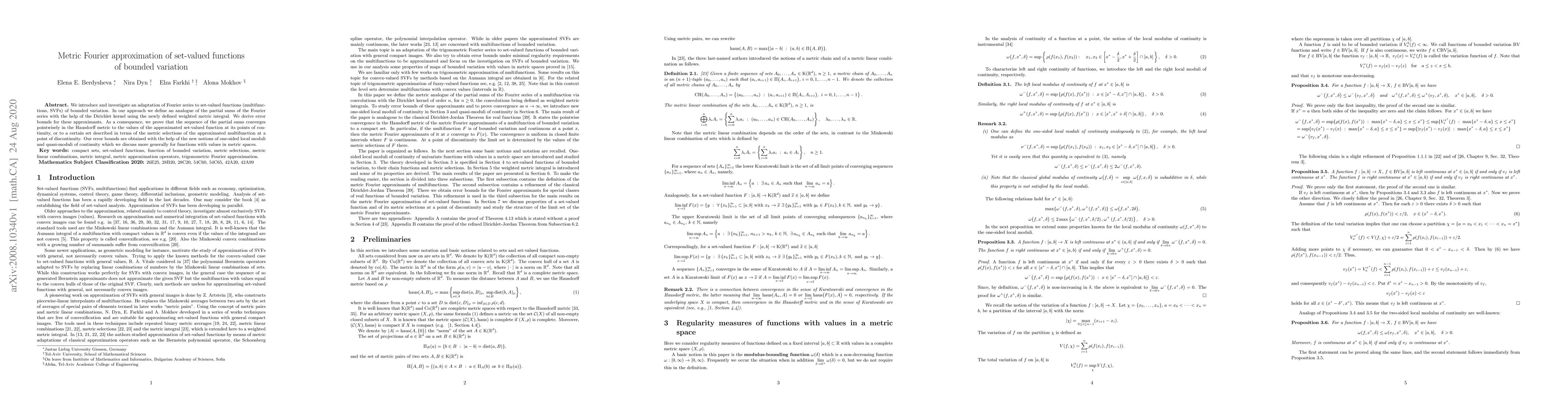 This paper adapts Fourier series to set-valued functions of bounded variation, defining partial sums using a weighted metric integral and the Dirichlet kernel. It provides error bounds and proves pointwise convergence in the Hausdorff metric, introducing new notions of continuity for metric space-valued functions.