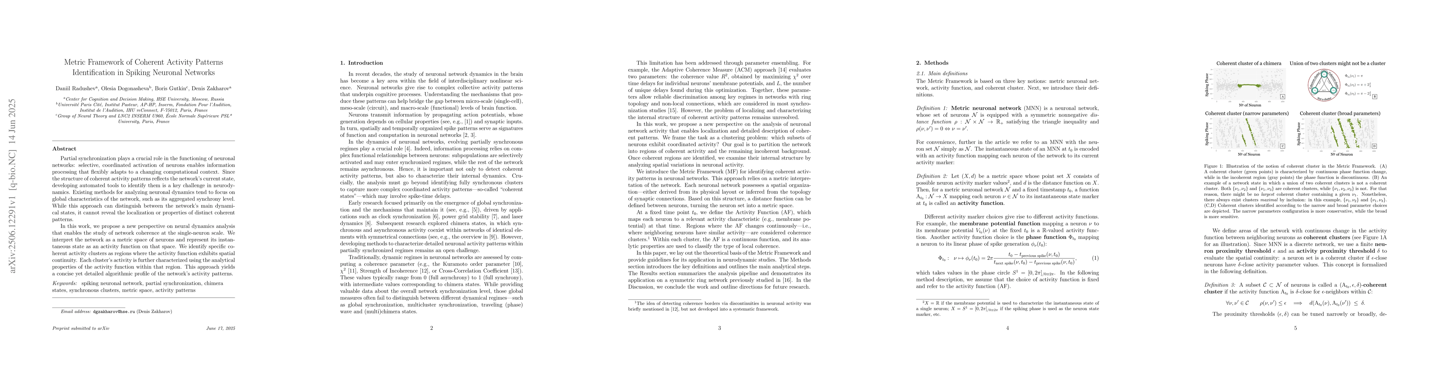 Partial synchronization plays a crucial role in the functioning of neuronal networks: selective, coordinated activation of neurons enables information processing that flexibly adapts to a changing computational context. Since the structure of coherent activity patterns reflects the network's current state, developing automated tools to identify them is a key challenge in neurodynamics. Existing methods for analyzing neuronal dynamics tend to focus on global characteristics of the network, such as its aggregated synchrony level. While this approach can distinguish between the network's main dynamical states, it cannot reveal the localization or properties of distinct coherent patterns. In this work, we propose a new perspective on neural dynamics analysis that enables the study of network coherence at the single-neuron scale. We interpret the network as a metric space of neurons and represent its instantaneous state as an activity function on that space. We identify specific coherent activity clusters as regions where the activity function exhibits spatial continuity. Each cluster's activity is further characterized using the analytical properties of the activity function within that region. This approach yields a concise yet detailed algorithmic profile of the network's activity patterns.