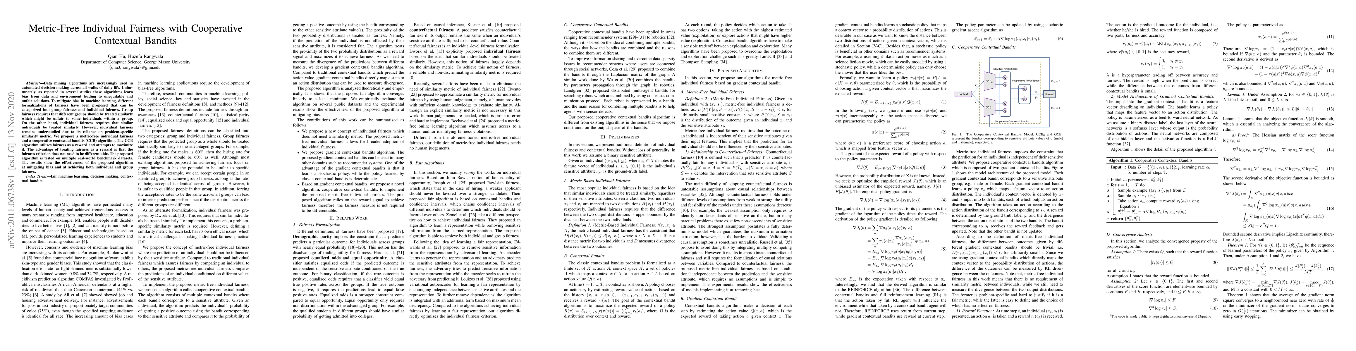 This paper proposes a metric-free individual fairness algorithm using cooperative contextual bandits to mitigate bias in machine learning models. It effectively achieves both individual and group fairness on multiple real-world benchmark datasets.