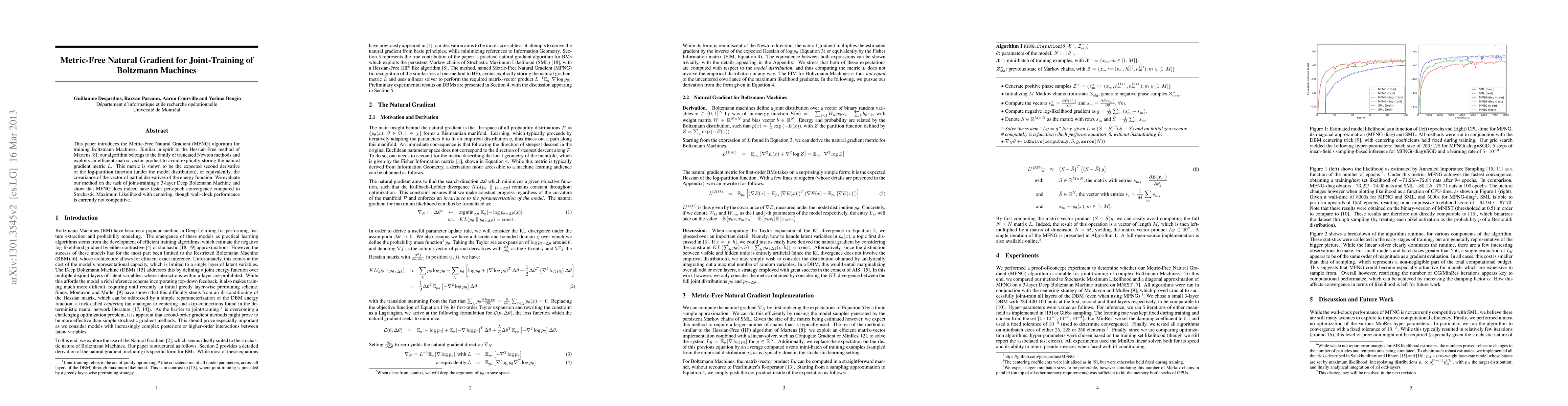 This paper proposes the Metric-Free Natural Gradient (MFNG) algorithm for training Boltzmann Machines, which avoids storing the natural gradient metric by using efficient matrix-vector products. The method shows faster per-epoch convergence in joint-training a 3-layer Deep Boltzmann Machine compared to Stochastic Maximum Likelihood with centering.