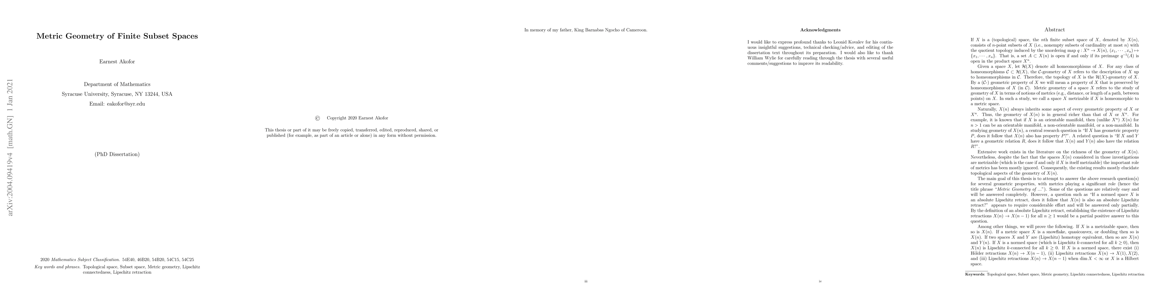 If $X$ is a (topological) space, the $n$th finite subset space of $X$, denoted by $X(n)$, consists of $n$-point subsets of $X$ (i.e., nonempty subsets of cardinality at most $n$) with the quotient topology induced by the unordering map $q:X^n\to X(n)$, $(x_1,\cdots,x_n)\mapsto\{x_1,\cdots,x_n\}$. That is, a set $A\subset X(n)$ is open if and only if its preimage $q^{-1}(A)$ is open in the product space $X^n$. Given a space $X$, let $H(X)$ denote all homeomorphisms of $X$. For any class of homeomorphisms $C\subset H(X)$, the $C$-geometry of $X$ refers to the description of $X$ up to homeomorphisms in $C$. Therefore, the topology of $X$ is the $H(X)$-geometry of $X$. By a ($C$-) geometric property of $X$ we will mean a property of $X$ that is preserved by homeomorphisms of $X$ (in $C$). Metric geometry of a space $X$ refers to the study of geometry of $X$ in terms of notions of metrics (e.g., distance, or length of a path, between points) on $X$. In such a study, we call a space $X$ metrizable if $X$ is homeomorphic to a metric space. Naturally, $X(n)$ always inherits some aspect of every geometric property of $X$ or $X^n$. Thus, the geometry of $X(n)$ is in general richer than that of $X$ or $X^n$. For example, it is known that if $X$ is an orientable manifold, then (unlike $X^n$) $X(n)$ for $n>1$ can be an orientable manifold, a non-orientable manifold, or a non-manifold. In studying geometry of $X(n)$, a central research question is "If $X$ has geometric property $P$, does it follow that $X(n)$ also has property $P$?". A related question is "If $X$ and $Y$ have a geometric relation $R$, does it follow that $X(n)$ and $Y(n)$ also have the relation $R$?". (Truncated)