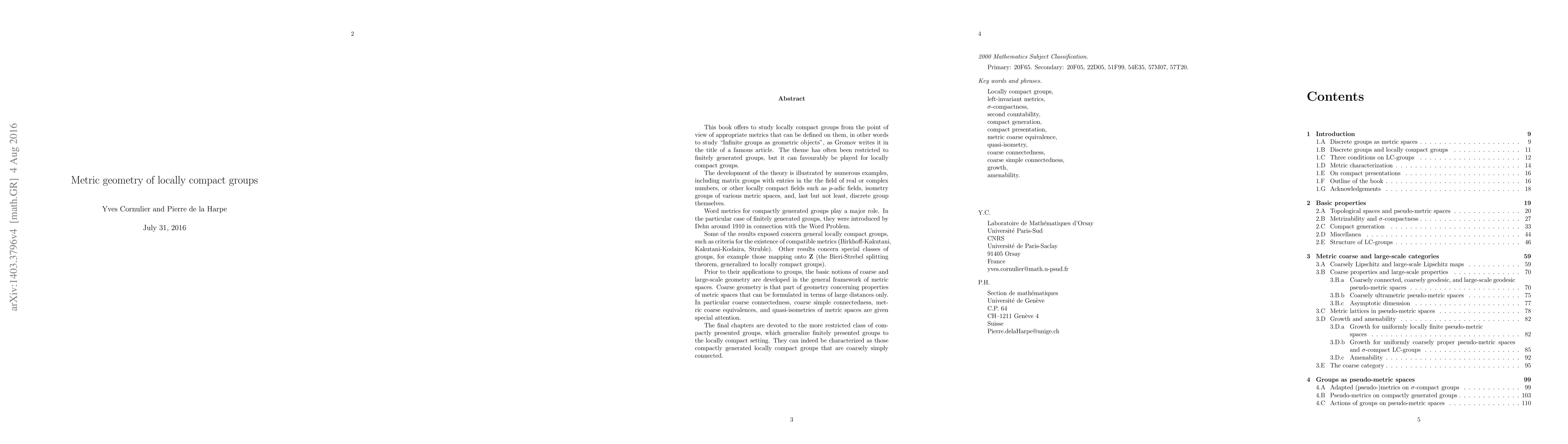 This book explores locally compact groups through appropriate metrics, studying them as "infinite groups as geometric objects." It develops the theory of coarse and large-scale geometry, introducing word metrics for compactly generated groups, and provides criteria for compatible metrics, illustrated by examples like matrix groups and discrete groups.