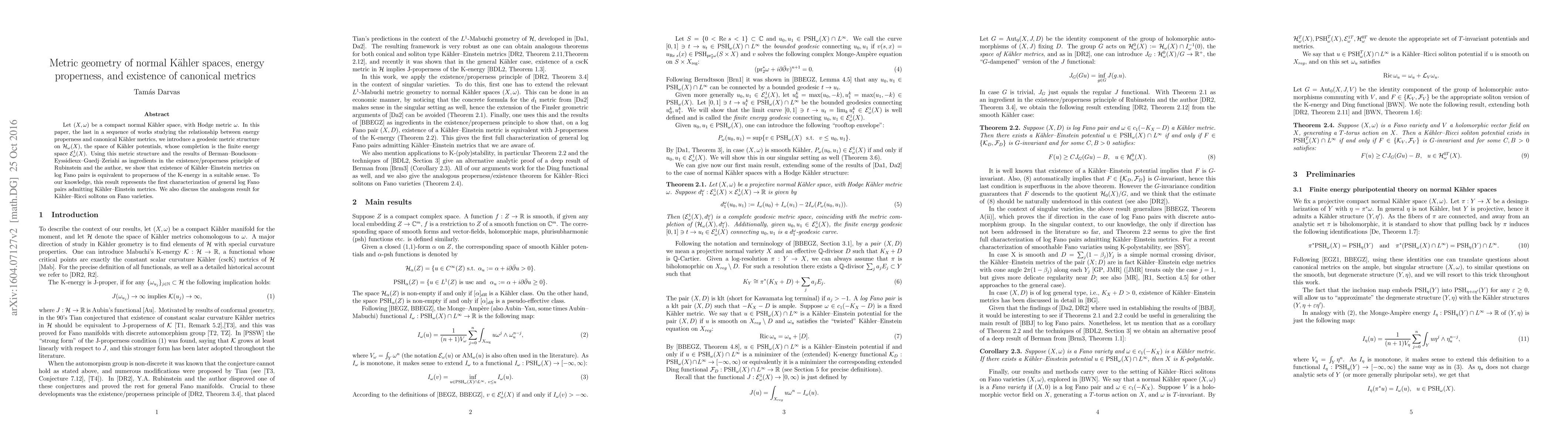 Let $(X,\omega)$ be a compact normal K\"ahler space, with Hodge metric $\omega$. In this paper, the last in a sequence of works studying the relationship between energy properness and canonical K\"ahler metrics, we introduce a geodesic metric structure on $\mathcal H_{\omega}(X)$, the space of K\"ahler potentials, whose completion is the finite energy space $\mathcal E^1_{\omega}(X)$. Using this metric structure and the results of Berman-Boucksom-Eyssidieux-Guedj-Zeriahi as ingredients in the existence/properness principle of Rubinstein and the author, we show that existence of K\"ahler-Einstein metrics on log Fano pairs is equivalent to properness of the K-energy in a suitable sense. To our knowledge, this result represents the first characterization of general log Fano pairs admitting K\"ahler-Einstein metrics. We also discuss the analogous result for K\"ahler-Ricci solitons on Fano varieties.