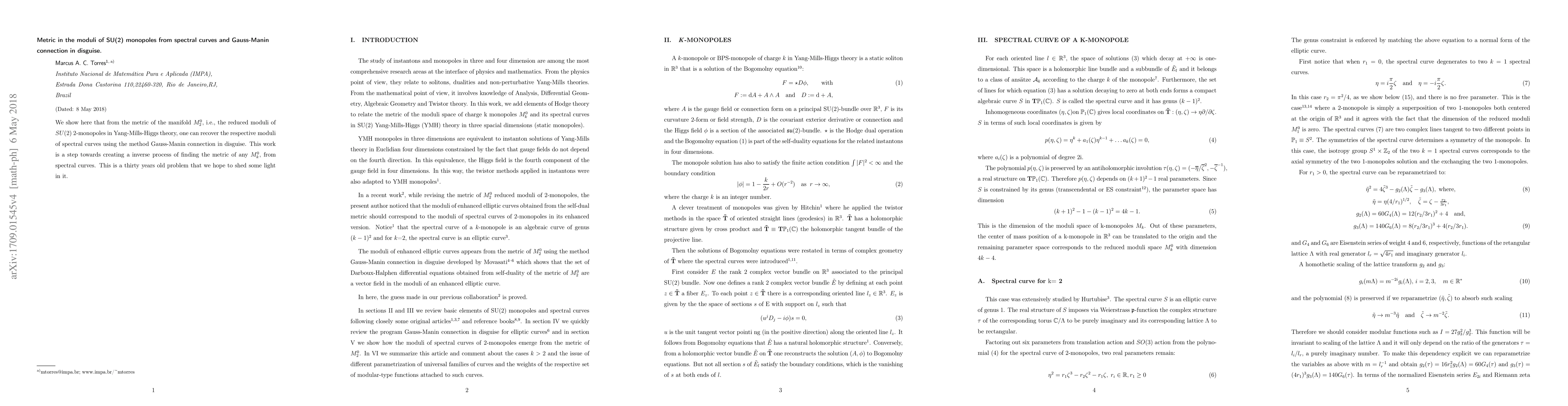 We show here that from the metric of the manifold $M^0_2$ , i.e., the reduced moduli of SU(2) 2-monopoles in Yang-Mills-Higgs theory, one can recover the respective moduli of spectral curves using the method Gauss-Manin connection in disguise. This work is a step towards creating a inverse process of finding the metric of any $M^0_k$ , from spectral curves. This is a thirty years old problem that we hope to shed some light in it.