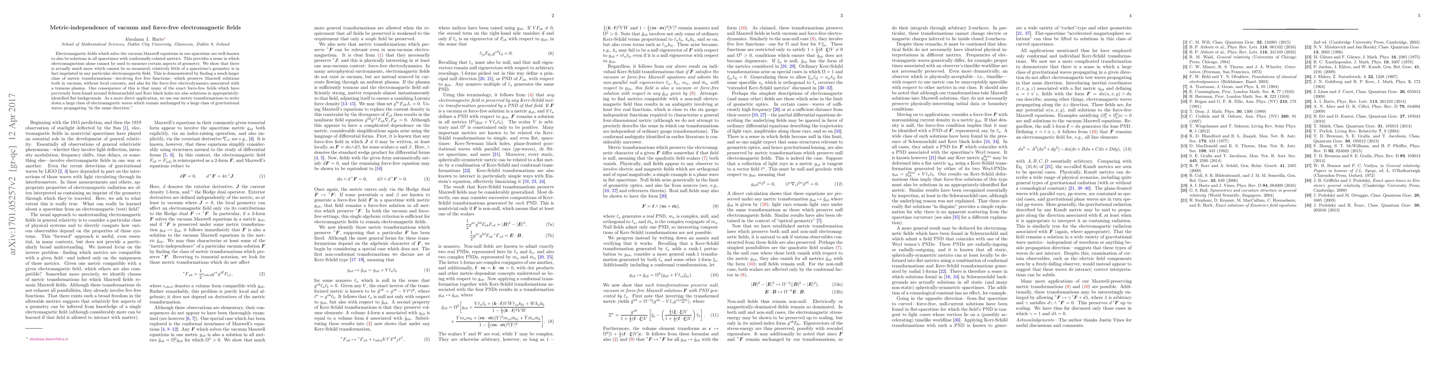 This paper explores the invariance of vacuum and force-free electromagnetic fields under a broad class of metric transformations, demonstrating that little spacetime geometry is imprinted in these fields. It reveals that many previously found exact force-free fields around black holes are also solutions in flat backgrounds, and introduces a class of electromagnetic waves unaffected by specific gravitational waves.