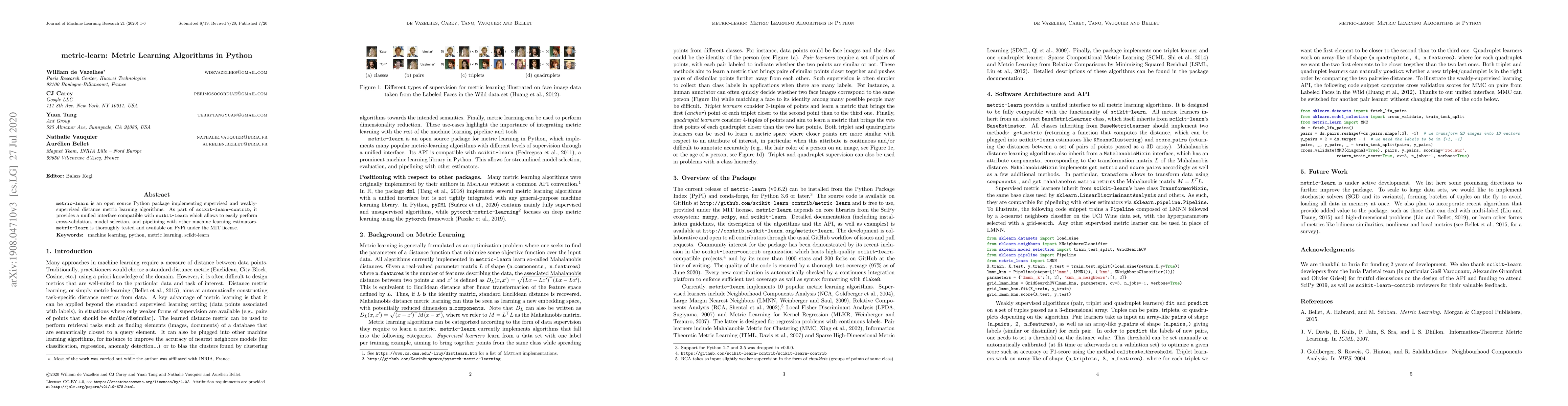 metric-learn is an open source Python package implementing supervised and weakly-supervised distance metric learning algorithms. As part of scikit-learn-contrib, it provides a unified interface compatible with scikit-learn which allows to easily perform cross-validation, model selection, and pipelining with other machine learning estimators. metric-learn is thoroughly tested and available on PyPi under the MIT licence.