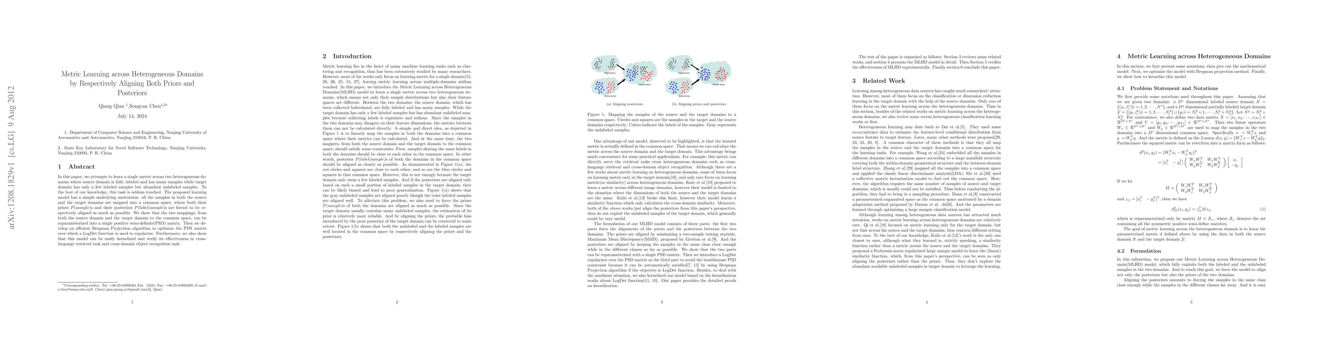 This paper proposes a metric learning model to align both priors and posteriors across two heterogeneous domains, optimizing a single positive semi-definite matrix using a Bregman Projection algorithm. The model is shown to be effective in cross-language retrieval and cross-domain object recognition tasks.