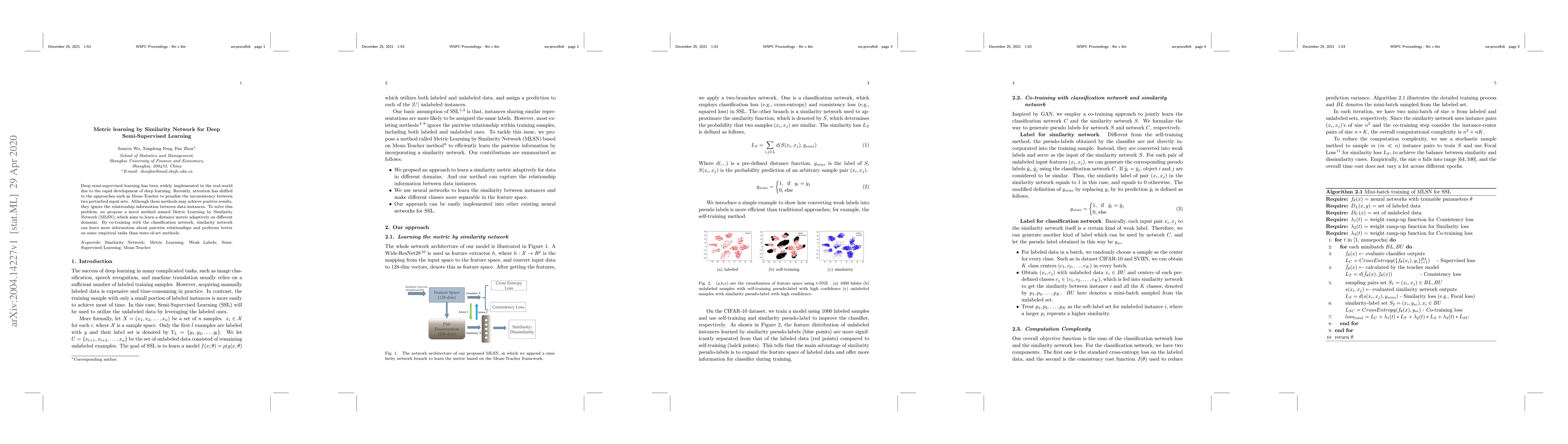 Deep semi-supervised learning has been widely implemented in the real-world due to the rapid development of deep learning. Recently, attention has shifted to the approaches such as Mean-Teacher to penalize the inconsistency between two perturbed input sets. Although these methods may achieve positive results, they ignore the relationship information between data instances. To solve this problem, we propose a novel method named Metric Learning by Similarity Network (MLSN), which aims to learn a distance metric adaptively on different domains. By co-training with the classification network, similarity network can learn more information about pairwise relationships and performs better on some empirical tasks than state-of-art methods.