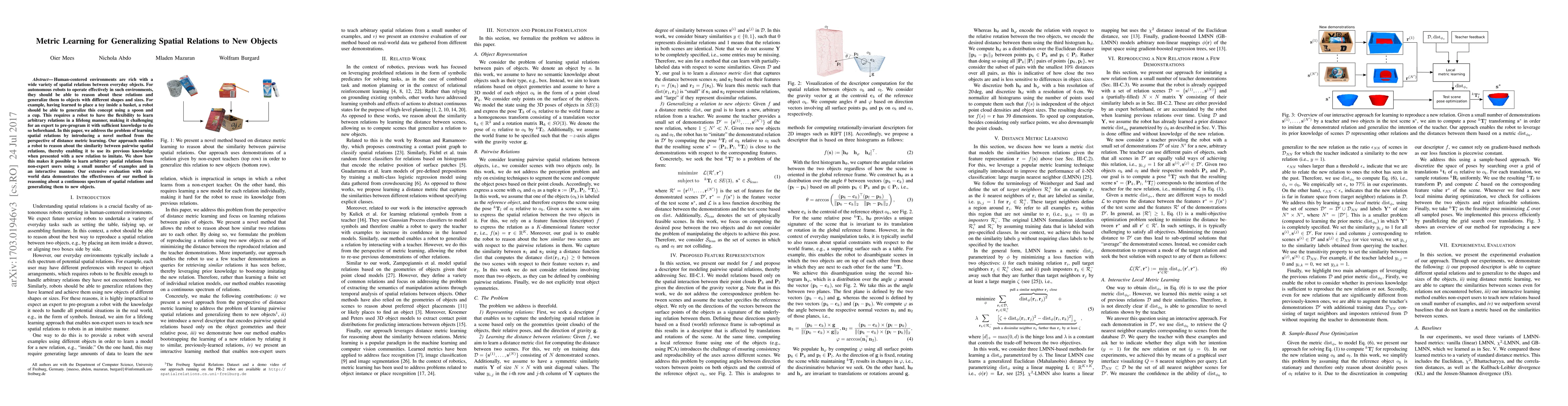 This paper introduces a novel metric learning method to enable robots to reason about and generalize spatial relations between objects, allowing them to learn new relations from a few examples provided by non-expert users. The method effectively reasons about the similarity between spatial relations, demonstrating success in real-world evaluations.