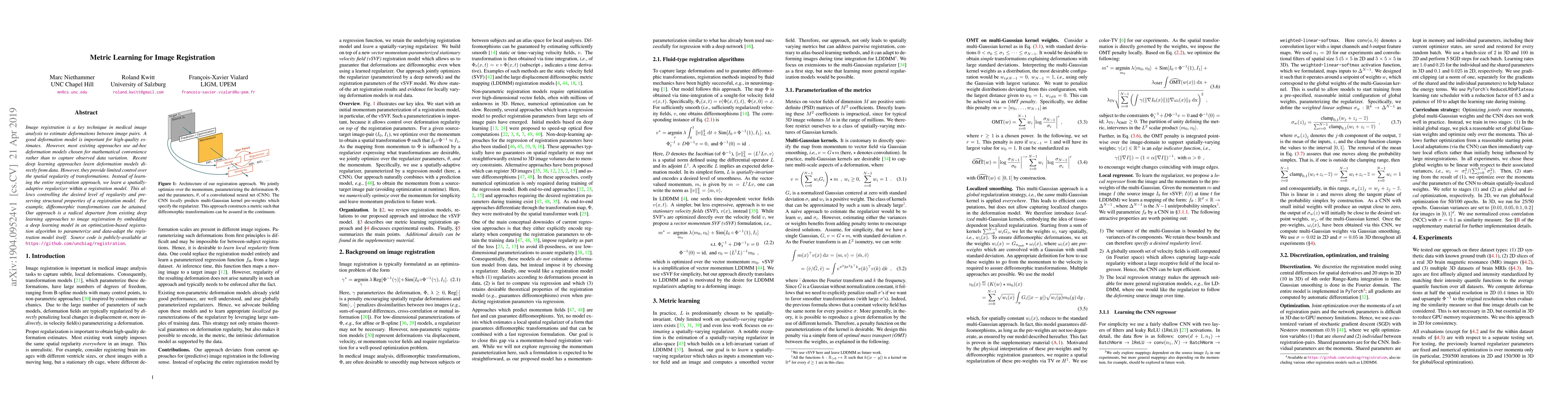 This paper proposes a novel metric learning method for image registration that embeds a deep learning model within an optimization-based framework to adaptively regularize the registration process. This approach allows for control over the spatial regularity of transformations while preserving structural properties, offering a significant improvement over existing ad-hoc and deep learning methods.
