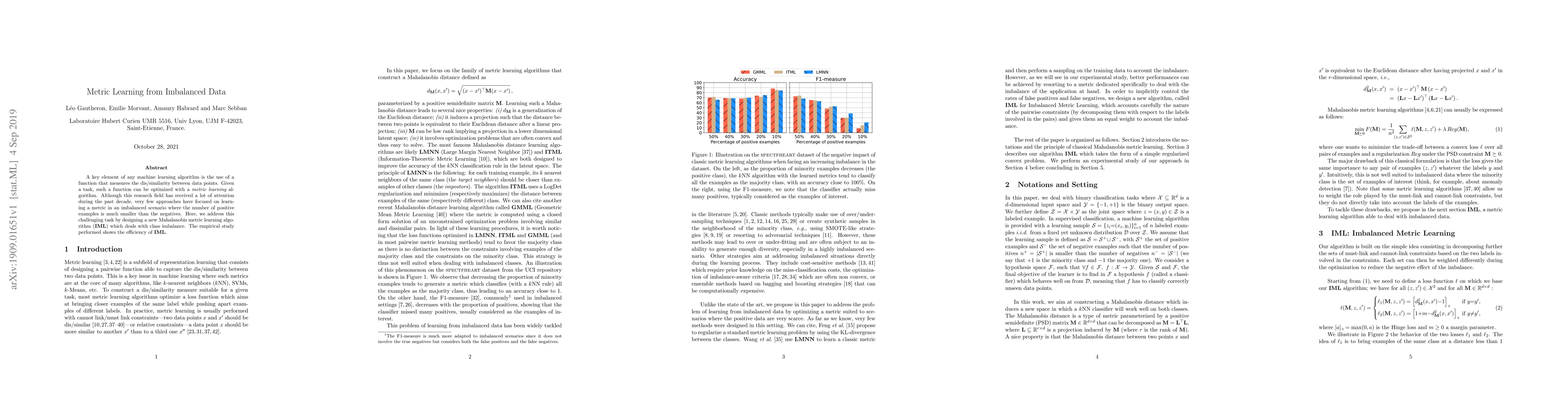 A key element of any machine learning algorithm is the use of a function that measures the dis/similarity between data points. Given a task, such a function can be optimized with a metric learning algorithm. Although this research field has received a lot of attention during the past decade, very few approaches have focused on learning a metric in an imbalanced scenario where the number of positive examples is much smaller than the negatives. Here, we address this challenging task by designing a new Mahalanobis metric learning algorithm (IML) which deals with class imbalance. The empirical study performed shows the efficiency of IML.