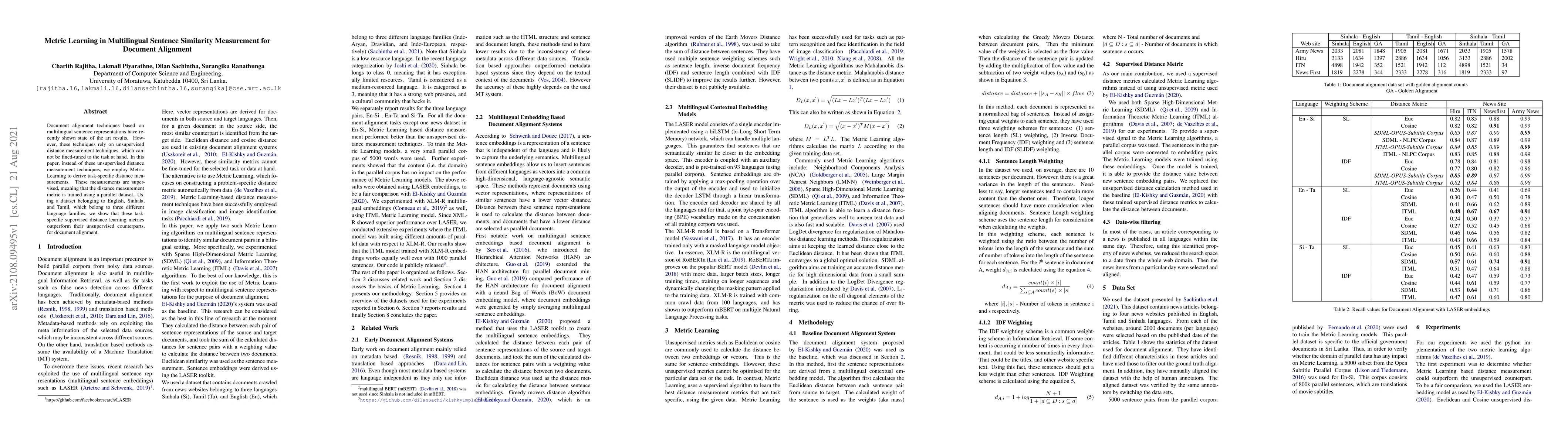 This paper proposes using Metric Learning to create task-specific distance measurements for multilingual sentence similarity in document alignment, outperforming traditional unsupervised methods. The approach is trained on a parallel dataset in English, Sinhala, and Tamil, demonstrating improved performance for document alignment.