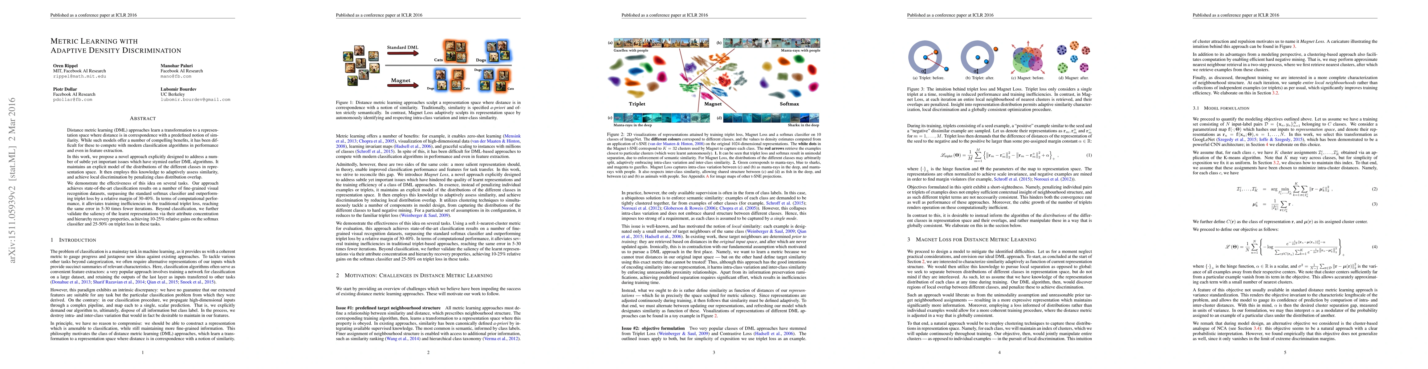 Distance metric learning (DML) approaches learn a transformation to a representation space where distance is in correspondence with a predefined notion of similarity. While such models offer a number of compelling benefits, it has been difficult for these to compete with modern classification algorithms in performance and even in feature extraction. In this work, we propose a novel approach explicitly designed to address a number of subtle yet important issues which have stymied earlier DML algorithms. It maintains an explicit model of the distributions of the different classes in representation space. It then employs this knowledge to adaptively assess similarity, and achieve local discrimination by penalizing class distribution overlap. We demonstrate the effectiveness of this idea on several tasks. Our approach achieves state-of-the-art classification results on a number of fine-grained visual recognition datasets, surpassing the standard softmax classifier and outperforming triplet loss by a relative margin of 30-40%. In terms of computational performance, it alleviates training inefficiencies in the traditional triplet loss, reaching the same error in 5-30 times fewer iterations. Beyond classification, we further validate the saliency of the learnt representations via their attribute concentration and hierarchy recovery properties, achieving 10-25% relative gains on the softmax classifier and 25-50% on triplet loss in these tasks.