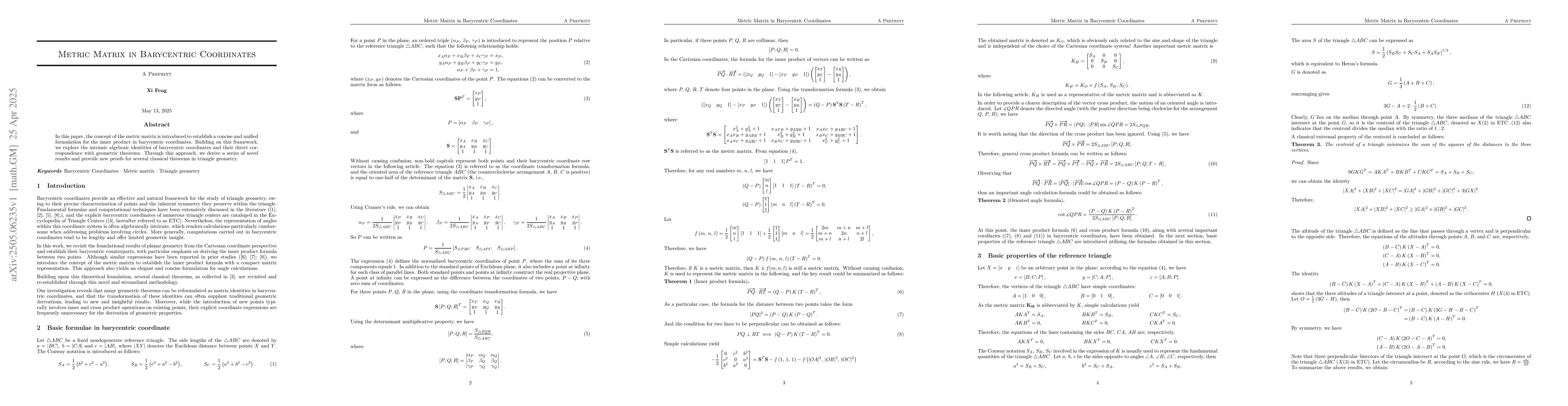 The research introduces a metric matrix to provide a matrix representation of the inner product in barycentric coordinates, deriving novel results and proving classical theorems in triangle geometry.