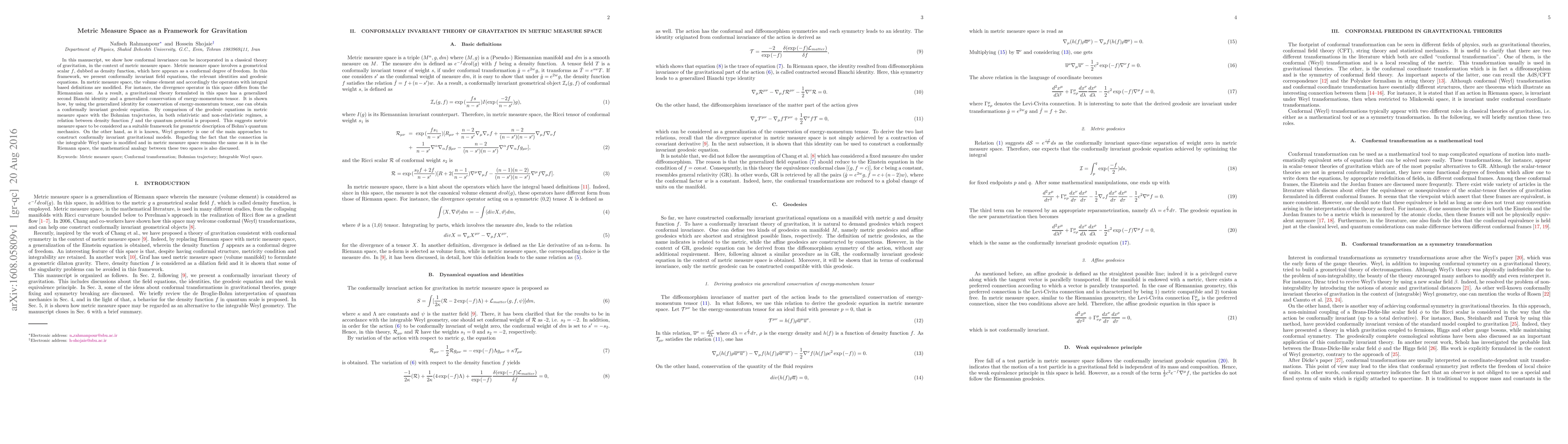 This paper proposes metric measure space as a framework for a conformally invariant theory of gravitation, incorporating a density function as a conformal degree of freedom. It presents generalized field equations and conservation laws, and suggests a relation between the density function and quantum potential, linking this framework to Bohm's quantum mechanics.