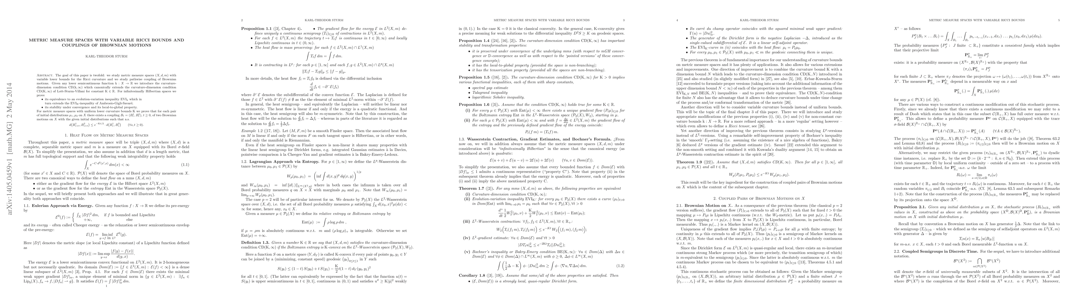 The goal of this paper is twofold: we study metric measure spaces $(X,d,m)$ with variable lower bounds for the Ricci curvature and we study pathwise coupling of Brownian motions. Given any lower semicontinuous function $k:X\to \mathbb R$ we introduce the curvature-dimension condition $CD(k,\infty)$ which canonically extends the curvature-dimension condition $CD(K,\infty)$ of Lott-Sturm-Villani for constant $K\in \mathbb R$. For infinitesimally Hilbertian spaces we prove i) its equivalence to an evolution-variation inequality $EVI_k$ which in turn extends the $EVI_K$-inequality of Ambrosio-Gigli-Savar\'e; ii) its stability under convergence and its local-to-global property. For metric measure spaces with uniform lower curvature bounds $K$ we prove that for each pair of initial distributions $\mu_1,\mu_2$ on $X$ there exists a coupling $B_t=(B_t^1,B_t^2)$, $t\ge0$, of two Brownian motions on $X$ with the given initial distributions such that a.s. for all $s,t\ge0$ $$d(B^1_{s+t},B^2_{s+t})\le e^{-K t/2}\cdot d(B_s^1,B_s^2).$$