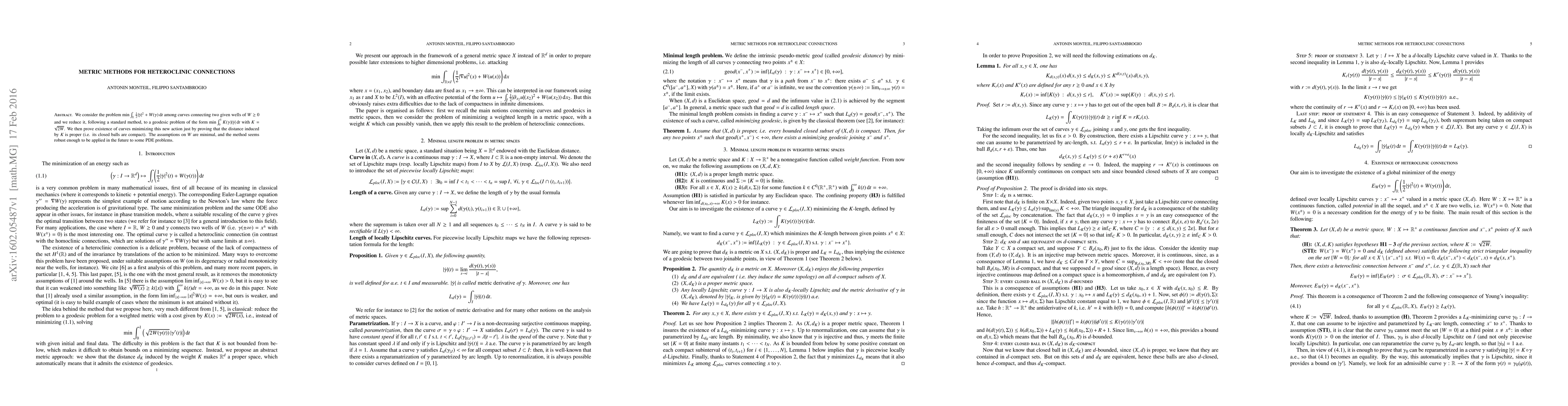 This research paper presents a method to find heteroclinic connections by minimizing an action involving a potential function W. The approach reduces the problem to a geodesic problem and proves existence of minimizing curves under minimal assumptions on W, showing potential for application in PDE problems.