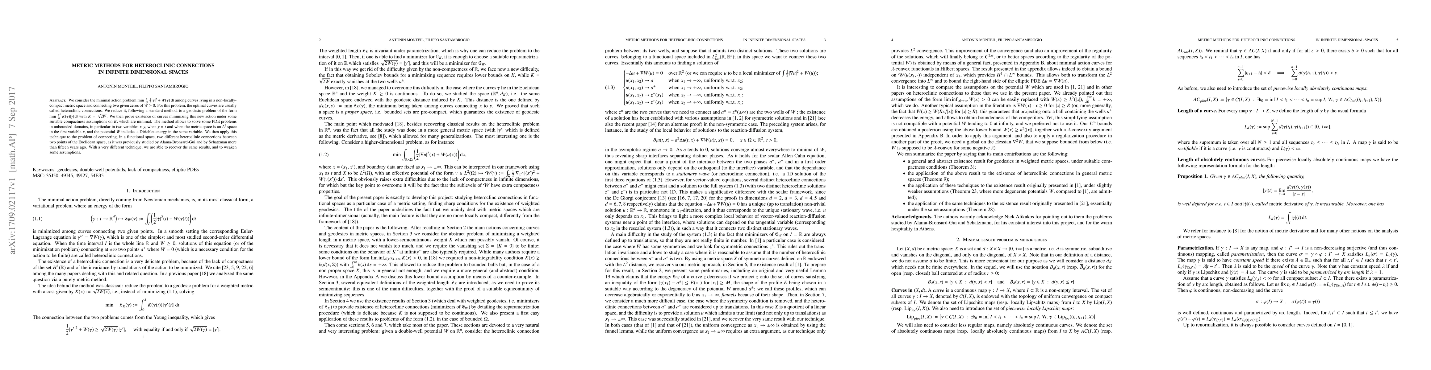 We consider the minimal action problem min \int\_R 1/2 |$\gamma$'|^2 + W($\gamma$) dt among curves lying in a non-locally-compact metric space and connecting two given zeros of W $\ge$ 0. For this problem, the optimal curves are usually called heteroclinic connections. We reduce it, following a standard method, to a geodesic problem of the form min \int\_0^1 K($\gamma$)|$\gamma$'| dt with K = (2W)^(1/2). We then prove existence of curves minimizing this new action under some suitable compactness assumptions on K, which are minimal. The method allows to solve some PDE problems in unbounded domains, in particular in two variables x, y, when y = t and when the metric space is an L^2 space in the first variable x, and the potential W includes a Dirichlet energy in the same variable. We then apply this technique to the problem of connecting, in a functional space, two different heteroclinic connections between two points of the Euclidean space, as it was previously studied by Alama-Bronsard-Gui and by Schatzman more than fifteen years ago. With a very different technique, we are able to recover the same results, and to weaken some assumptions.