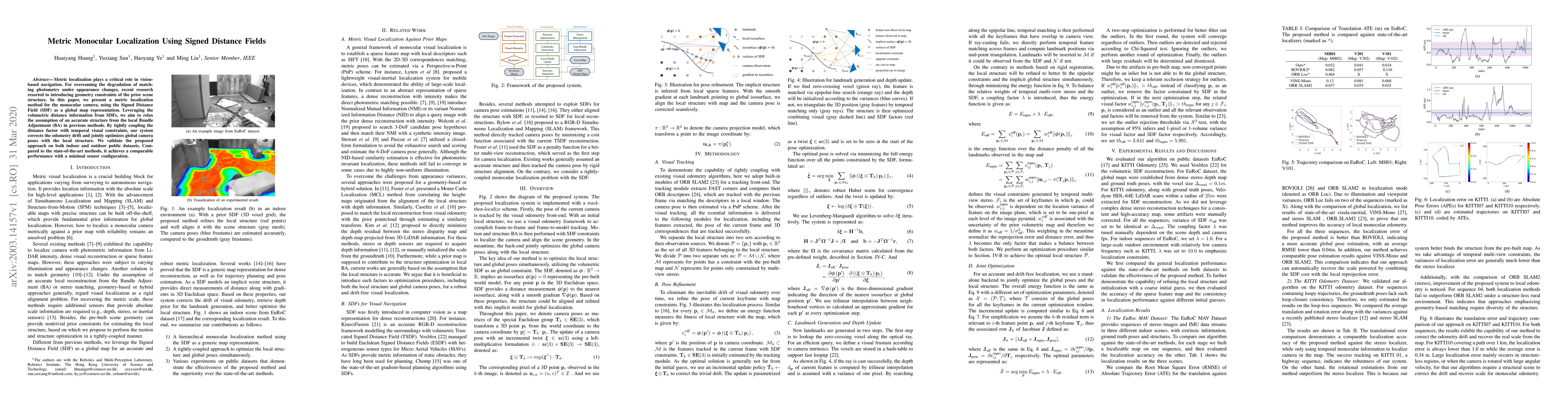 This research introduces a monocular camera localization method that uses Signed Distance Fields to improve accuracy and reduce reliance on detailed scene structure, effectively correcting odometry drift. The approach performs well in both indoor and outdoor environments, matching state-of-the-art results with minimal sensors.