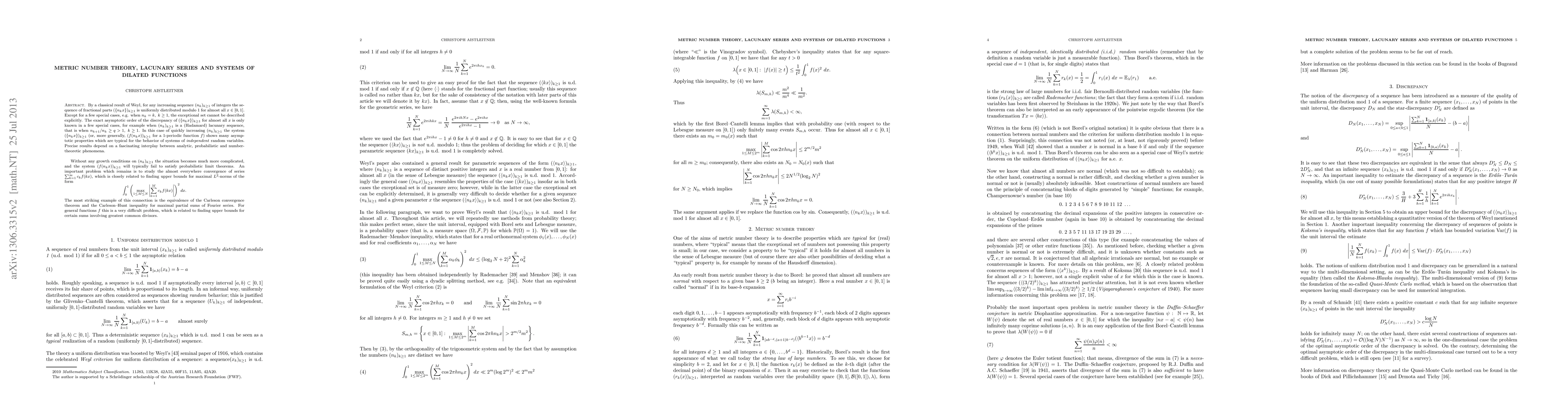 By a classical result of Weyl, for any increasing sequence $(n_k)_{k \geq 1}$ of integers the sequence of fractional parts $(\{n_k x\})_{k \geq 1}$ is uniformly distributed modulo 1 for almost all $x \in [0,1]$. Except for a few special cases, e.g. when $n_k=k, k \geq 1$, the exceptional set cannot be described explicitly. The exact asymptotic order of the discrepancy of $(\{n_k x\})_{k \geq 1}$ is only known in a few special cases, for example when $(n_k)_{k \geq 1}$ is a (Hadamard) lacunary sequence, that is when $n_{k+1}/n_k \geq q > 1, k \geq 1$. In this case of quickly increasing $(n_k)_{k \geq 1}$ the system $(\{n_k x\})_{k \geq 1}$ (or, more general, $(f(n_k x))_{k \geq 1}$ for a 1-periodic function $f$) shows many asymptotic properties which are typical for the behavior of systems of \emph{independent} random variables. Precise results depend on a fascinating interplay between analytic, probabilistic and number-theoretic phenomena. Without any growth conditions on $(n_k)_{k \geq 1}$ the situation becomes much more complicated, and the system $(f(n_k x))_{k \geq 1}$ will typically fail to satisfy probabilistic limit theorems. An important problem which remains is to study the almost everywhere convergence of series $\sum_{k=1}^\infty c_k f(k x)$, which is closely related to finding upper bounds for maximal $L^2$-norms of the form $$ \int_0^1 (\max_{1 \leq M \leq N}| \sum_{k=1}^M c_k f(kx)|^2 dx. $$ The most striking example of this connection is the equivalence of the Carleson convergence theorem and the Carleson--Hunt inequality for maximal partial sums of Fourier series. For general functions $f$ this is a very difficult problem, which is related to finding upper bounds for certain sums involving greatest common divisors.