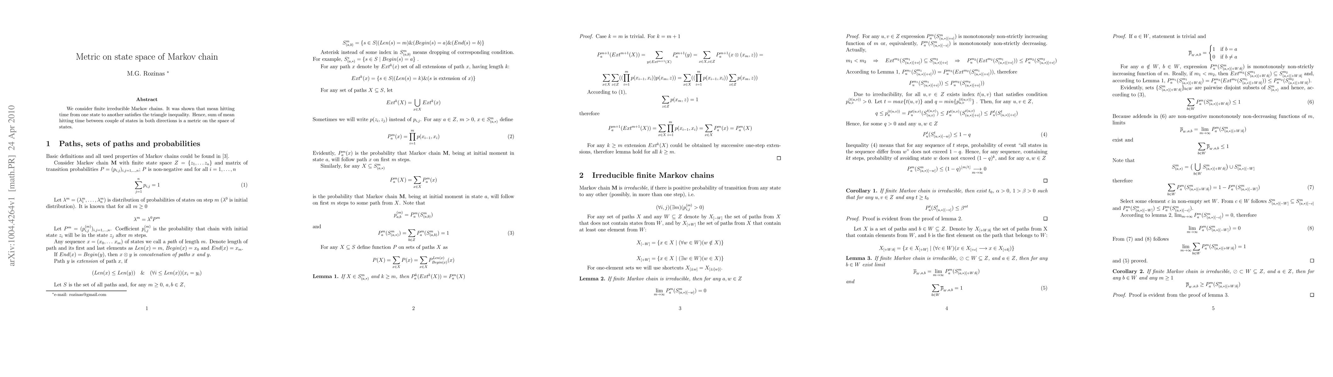 We consider finite irreducible Markov chains. It was shown that mean hitting time from one state to another satisfies the triangle inequality. Hence, sum of mean hitting time between couple of states in both directions is a metric on the space of states.