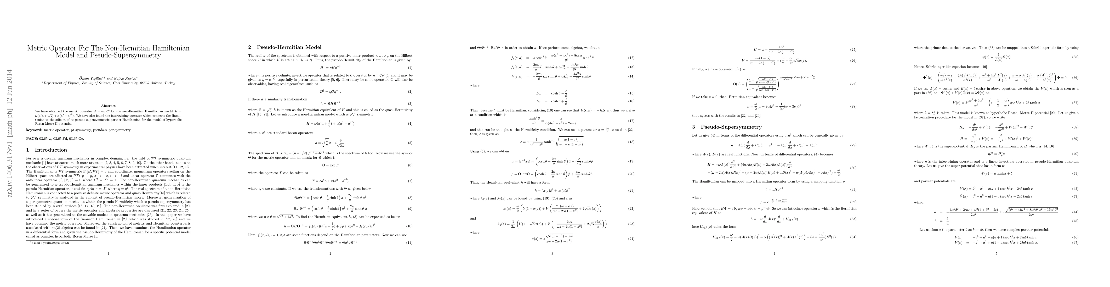 Summary: This paper introduces a metric operator $\Theta$ for a non-Hermitian Hamiltonian model and demonstrates its connection to the pseudo-supersymmetric partner Hamiltonian through an intertwining operator, specifically for the hyperbolic Rosen-Morse II potential.