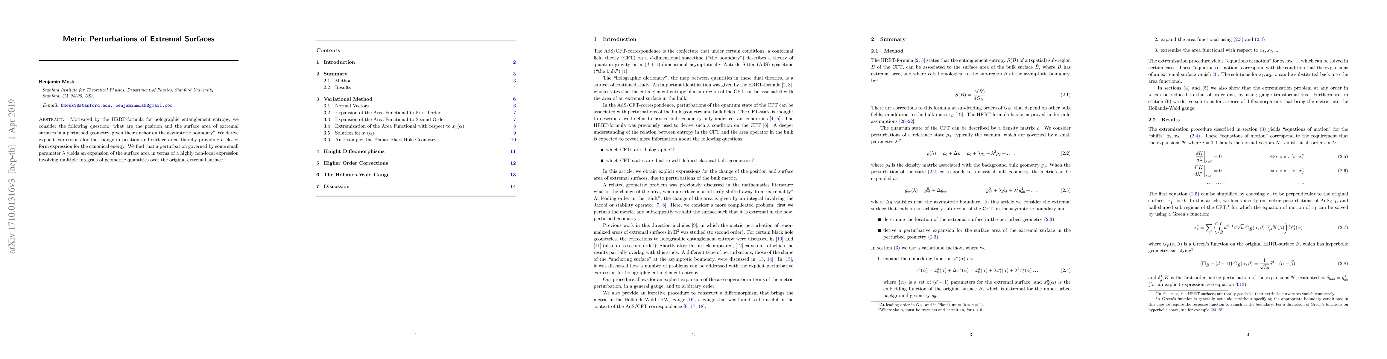 Motivated by the HRRT-formula for holographic entanglement entropy, we consider the following question: what are the position and the surface area of extremal surfaces in a perturbed geometry, given their anchor on the asymptotic boundary? We derive explicit expressions for the change in position and surface area, thereby providing a closed form expression for the canonical energy. We find that a perturbation governed by some small parameter $\lambda$ yields an expansion of the surface area in terms of a highly non-local expression involving multiple integrals of geometric quantities over the original extremal surface.