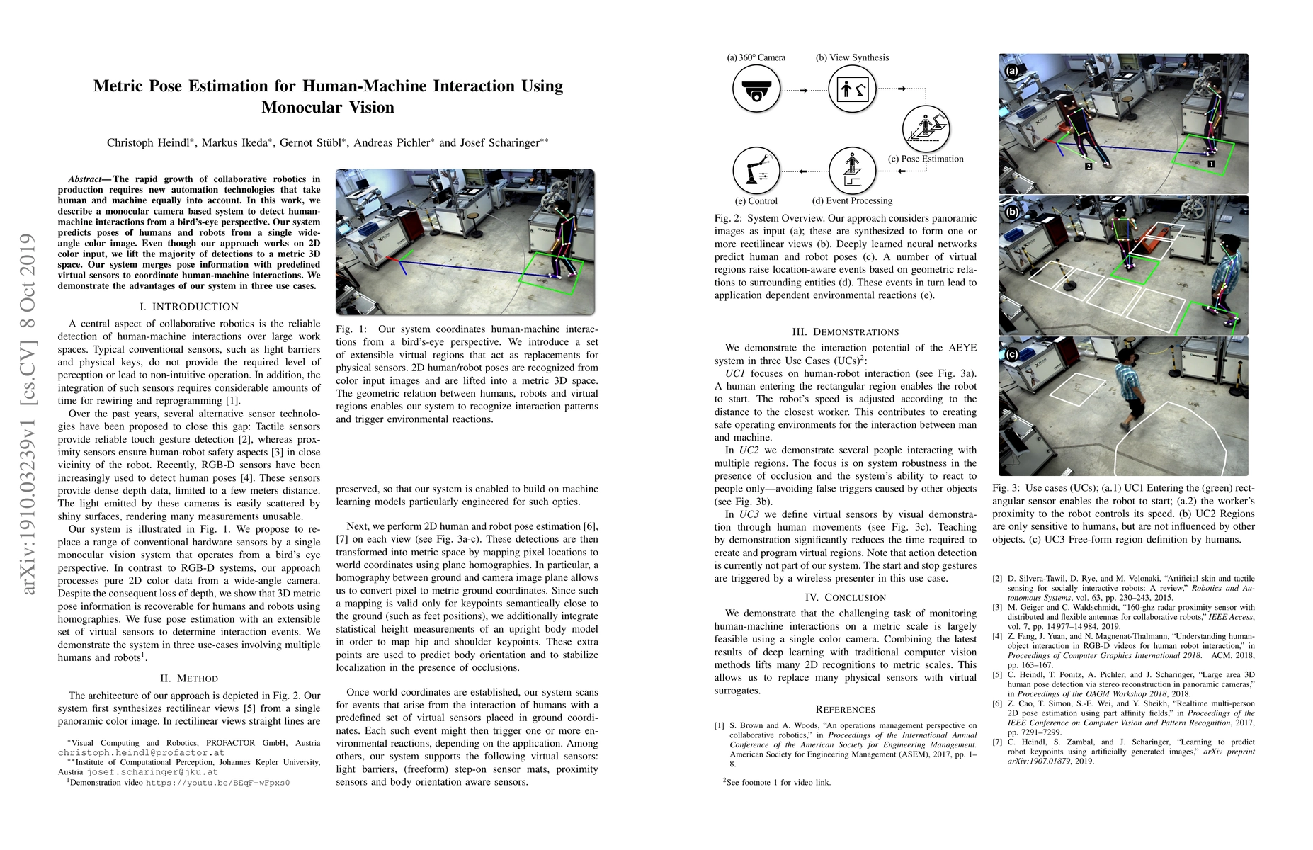 This paper presents a monocular vision system for estimating human and robot poses to facilitate human-machine interaction in collaborative robotics. The system converts 2D color image data into metric 3D space and integrates pose information with virtual sensors to coordinate interactions, demonstrating its effectiveness in three practical applications.