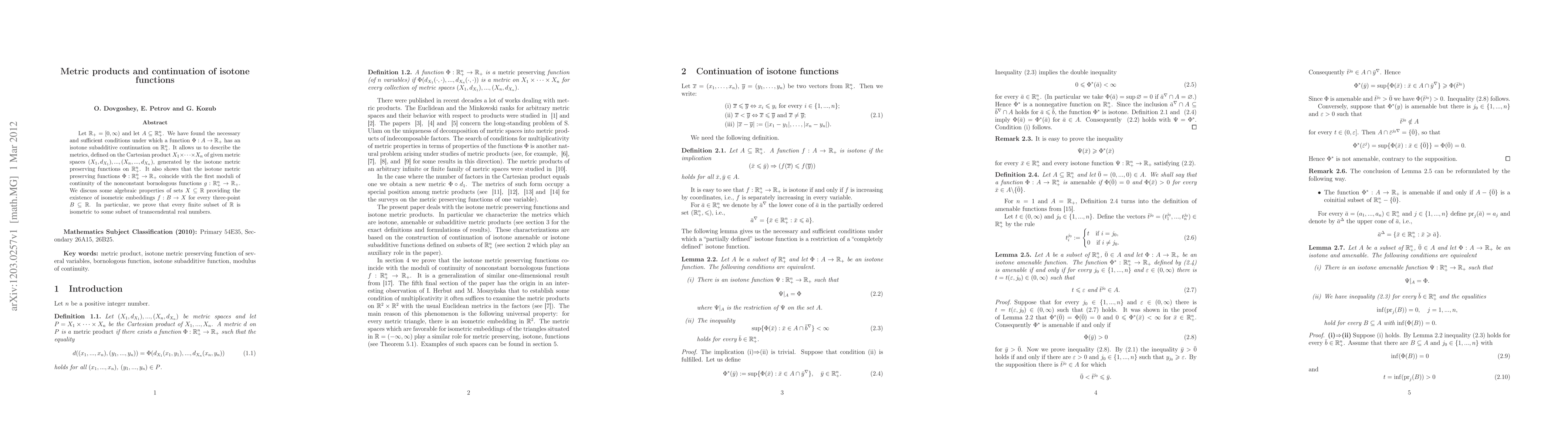 Let $\mathbb{R}_+=[0,\infty)$ and let $A\subseteq\mathbb{R}^n_+$. We have found the necessary and sufficient conditions under which a function $\Phi:A\to\mathbb{R}_+$ has an isotone subadditive continuation on $\mathbb{R}^n_+$. It allows us to describe the metrics, defined on the Cartesian product $X_1\times...\times X_n$ of given metric spaces $(X_1,d_{X_1}),...,(X_n,...,d_{X_n})$, generated by the isotone metric preserving functions on $\mathbb{R}^n_+$. It also shows that the isotone metric preserving functions $\Phi:\mathbb{R}^n_+\to\mathbb{R}_+$ coincide with the first moduli of continuity of the nonconstant bornologous functions $g:\mathbb{R}^n_+\to\mathbb{R}_+$. We discuss some algebraic properties of sets $X\subseteq \mathbb{R}$ providing the existence of isometric embeddings $f:B\to X$ for every three-point $B\subseteq \mathbb{R}$. In particular, we prove that every finite subset of $\mathbb{R}$ is isometric to some subset of transcendental real numbers.