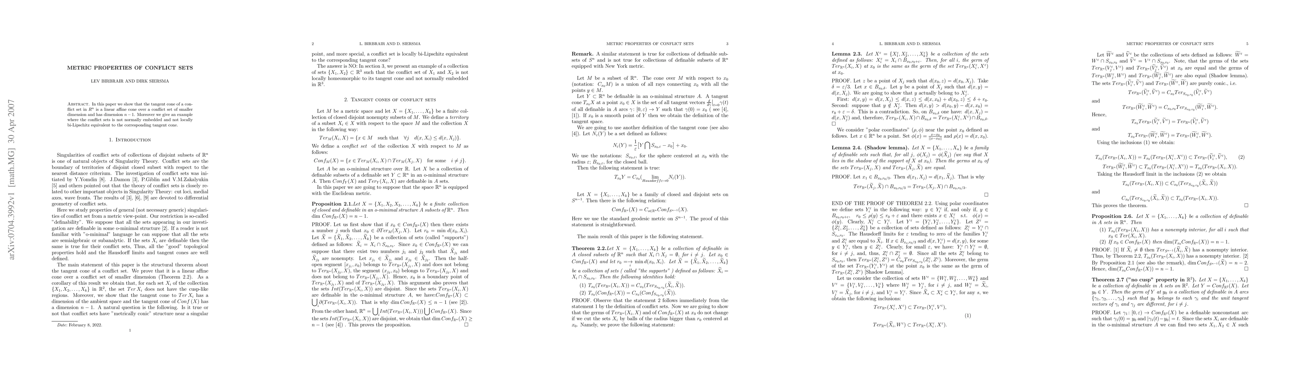 In this paper we show that the tangent cone of a conflict set in $R^n$ is a linear affine cone over a conflict set of smaller dimension and has dimension $n-1$. Moreover we give an example where the conflict sets is not normally embedded and not locally bi-Lipschitz equivalent to the corresponding tangent cone.