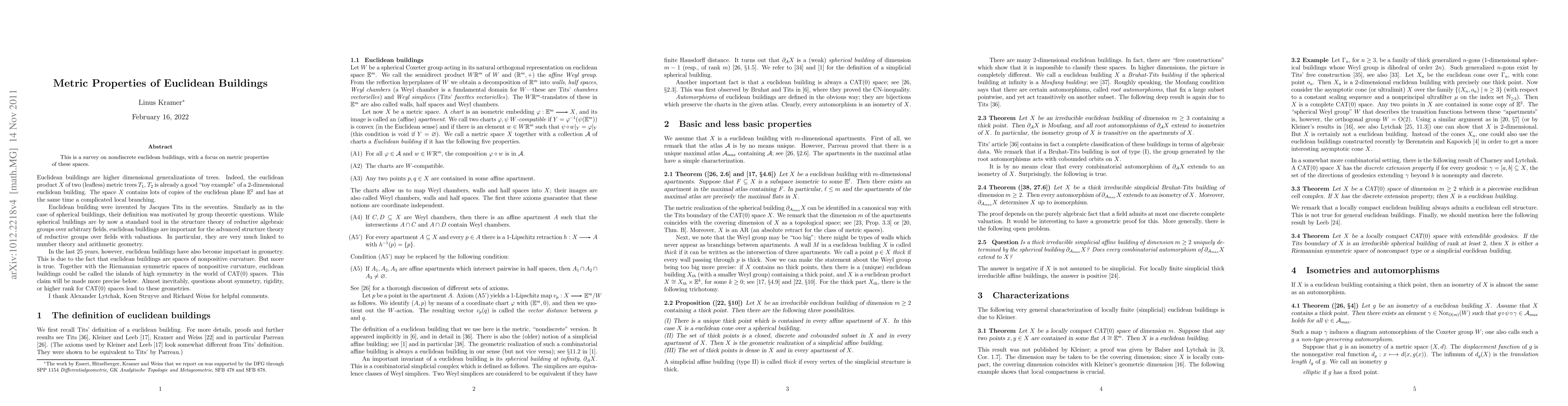 This survey investigates nondiscrete Euclidean buildings, emphasizing their metric properties and structural characteristics. It aims to provide a comprehensive overview of the geometrical and distance-related features inherent in these spaces.