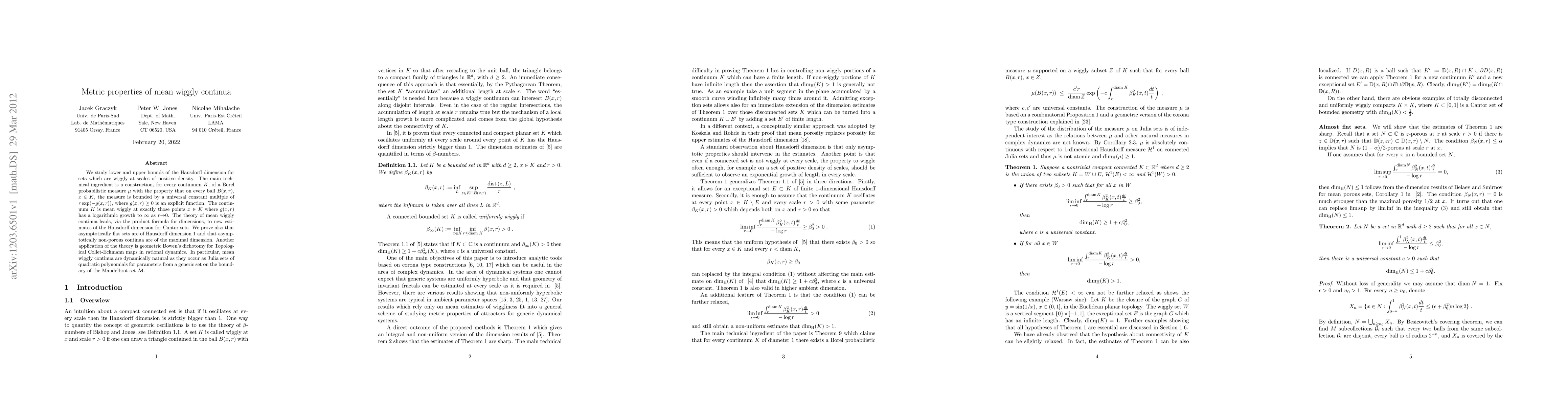 We study lower and upper bounds of the Hausdorff dimension for sets which are wiggly at scales of positive density. The main technical ingredient is a construction, for every continuum K, of a Borel probabilistic measure \mu with the property that on every ball B(x,r), with x in K, the measure is bounded by a universal constant multiple of r\exp(-g(x,r)), where g(x,r) > 0 is an explicit function. The continuum K is mean wiggly at exactly those points x in K where g(x, r) has a logarithmic growth to infinity as r goes to 0. The theory of mean wiggly continua leads, via the product formula for dimensions, to new estimates of the Hausdorff dimension for Cantor sets. We prove also that asymptotically flat sets are of Hausdorff dimension 1 and that asymptotically non-porous continua are of the maximal dimension. Another application of the theory is geometric Bowen's dichotomy for Topological Collet-Eckmann maps in rational dynamics. In particular, mean wiggly continua are dynamically natural as they occur as Julia sets of quadratic polynomials for parameters from a generic set on the boundary of the Mandelbrot set.