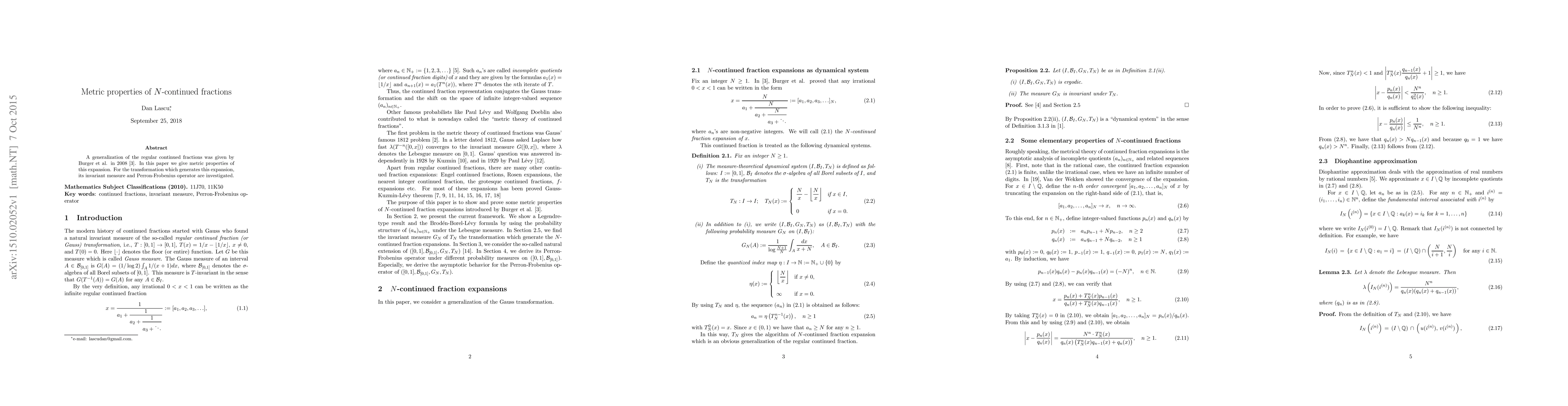 This paper investigates the metric properties of N-continued fractions, a generalization of regular continued fractions introduced by Burger et al. in 2008, focusing on the transformation's invariant measure and the associated Perron-Frobenius operator.