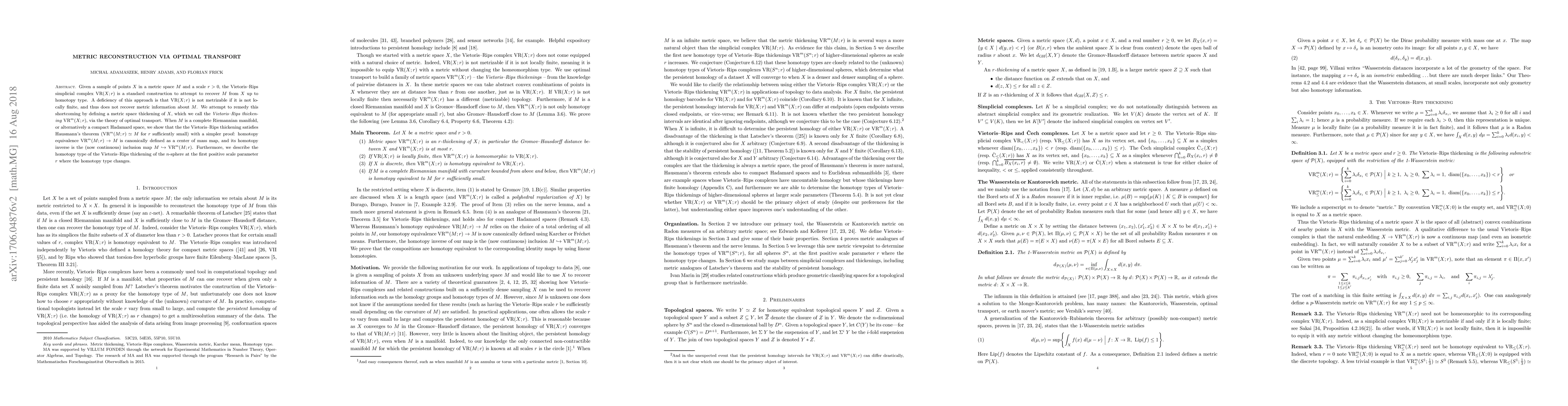 Researchers developed a new method to recover metric information from points in a space using optimal transport theory, overcoming limitations of traditional methods like Vietoris-Rips simplicial complex.